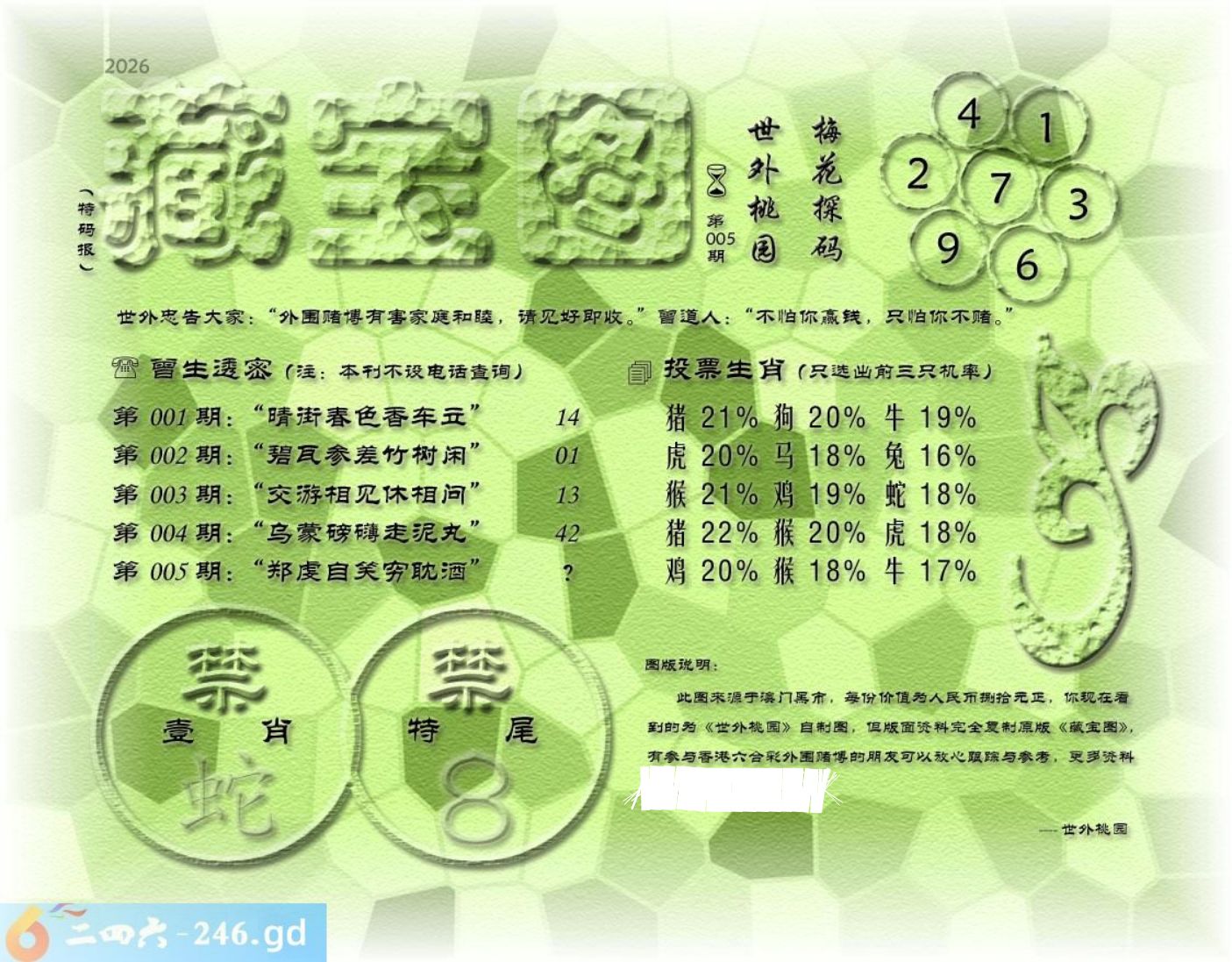 005期藏寶圖 新:倚阁尘消玉树空 老:郑虔自笑穷耽酒 禁:蛇 禁:8尾 玄機字:《滋》