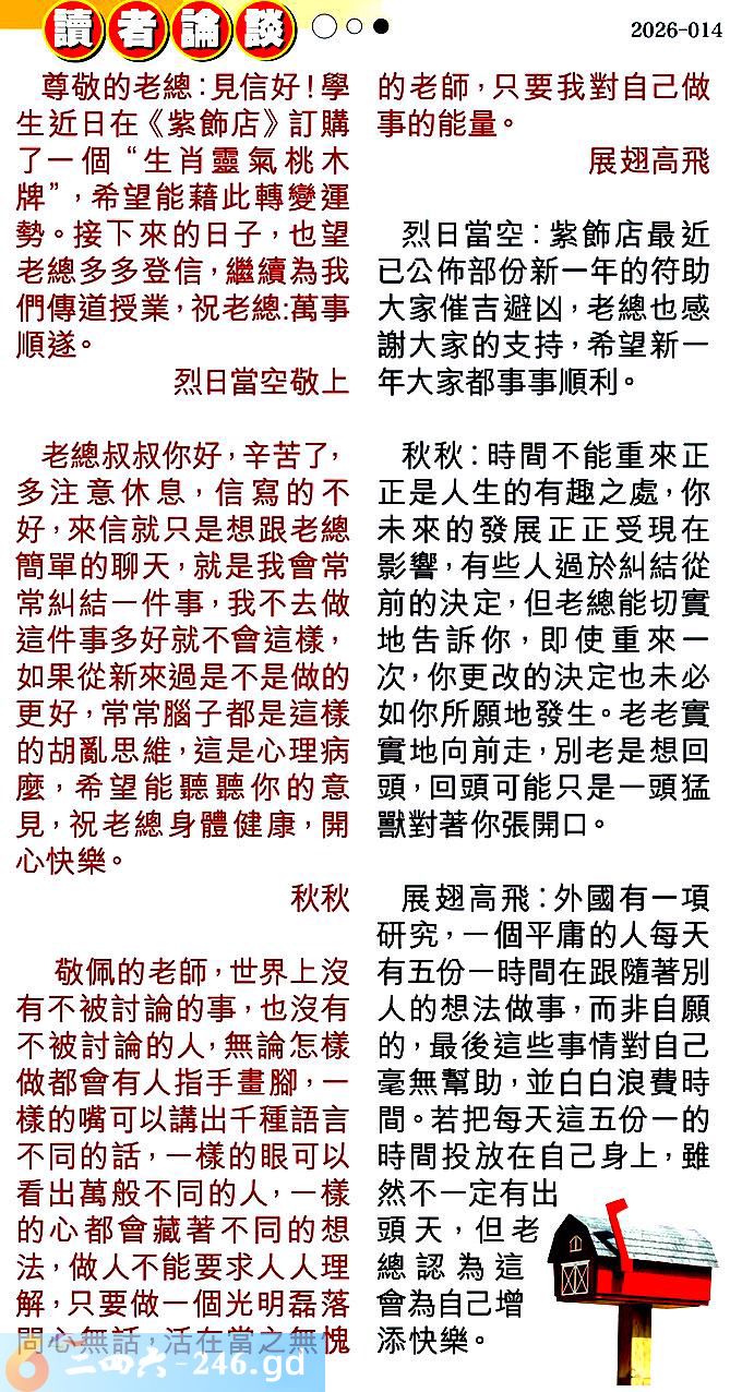 第014期讀者論談 1.尊敬的老總:見信好!學生近日在《紫飾店》訂購了一個“生肖重氣桃木牌”,希望能藉此轉變運勢。接下來的日子,也望老總多多登信,繼續為我們傳道授業,祝老總:萬事順遂。烈日當空敬上 〖烈日當空〗:紫飾店最近已公佈部份新一年的符助大家催吉避凶,老總也感謝大家的支持,希望新一年大家都事事順利。 2.老總叔叔你好,辛苦了,多注意休息,信寫的不好,來信就只是想跟老總簡單的聊天,就是我會常常糾結一件事,我不去做這件事多好就不會這樣,如果從新來過是不是做的更好,常常腦子都是這樣的胡亂思維,這是心理病麼,希望能聽聽你的意見,祝老總身體健康,開心快樂。秋秋 〖秋秋〗:時間不能重來正正是人生的有趣之處,你未來的發展正正受現在影響,有些人過於糾結從前的決定,但老總能切實地告訴你,即使重來一次,你更改的決定也未必如你所願地發生。老老實實地向前走,別老是想回頭,回頭可能只是一頭猛獸對著你張開口。 3.敬佩的老師,世界上沒有不被討論的事,也沒有不被討論的人,無論怎樣做都會有人指手畫腳,一樣的嘴可以講出千種語言不同的話,一樣的眼可以看出萬般不同的人,一樣的心都會藏著不同的想法,做人不能要求人人理解,只要做一個光明磊落問心無話,活在當之無愧的老師,只要我對自己做事的能量。展翅高飛 〖展翅高飛〗:外國有一項研究,一個平庸的人每天有五份一時間在跟隨著別人的想法做事,而非自願的,最後這些事情對自己毫無幫助,並白白浪費時間。若把每天這五份一的時間投放在自己身上,雖然不一定有出頭天,但老總會為自己增添快樂。