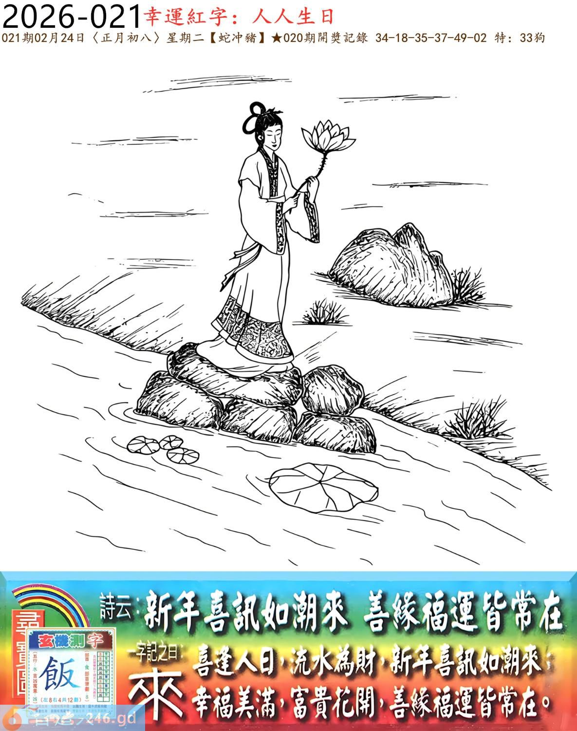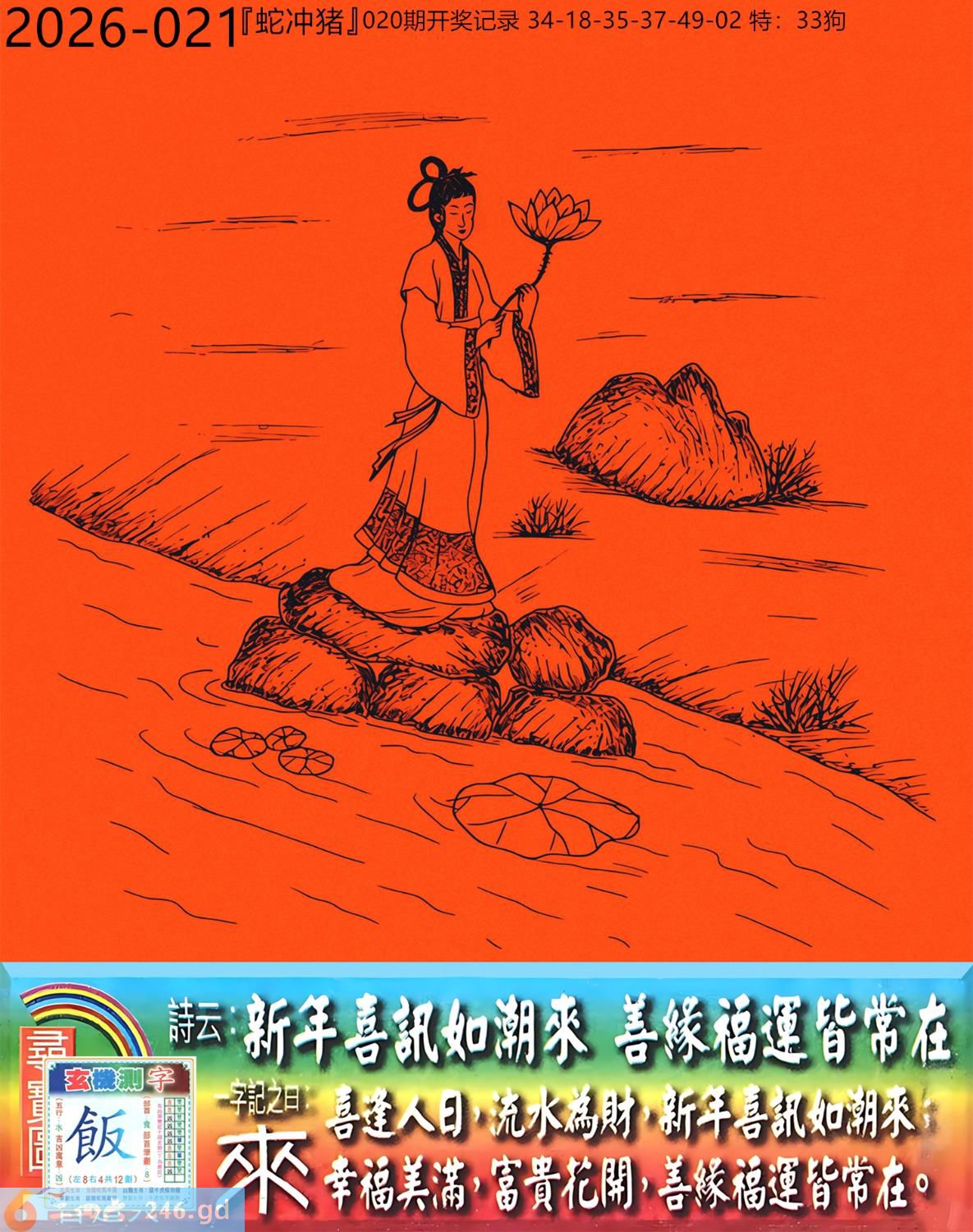 2026年2月24日021期侯(庚申(炉中火) 021期:老版跑狗玄機一字記之曰:【來】 詩云:新年喜訊如潮來善緣福運佳皆常在 喜逢人日,流水為財,新年喜訊如潮來; 幸福美滿,富貴花開,善緣福運佳皆常在。 玄機測字:《飯》 密圖詩:一方熱來一方冷 《記》:落入平川斷其尾 特碼大小單雙句:今期看單來發財 今期必中:曹操 021期:特碼歇后語 快刀砍水-----难分开 021期正版四字梅花诗:虎斗龙争。 021期火车头:烧伤马。诗:猪死猴伤,一九三肖对一双。 021期香港第一手欲钱料:顶天。 021期曾道人说:“马?” 021期另版四字梅花诗:鸡年贺喜。 021期香港第一手欲钱料:欲钱找灵小的动物。 021期曾道人说:“为什么有钱的人喜欢争夺名利”? 021期:二字經:一二 021期:穷鬼子是特码 021期:智力金壤;再接再厉 021期:信箱紅字:【少壯努力】 021期:【暗碼:04-11-27-31】 021期:一語中特:【三三不盡】 發財玄機圖:一日千里風馳電掣圖中明馬紅藍 021期:藏寳圖 新:飞流便向砌边挂 老:锦袖歌残翠黛尘 禁:兔禁:0尾玄機字《颉》 2026年021期【生活幽默】版 〖吃個蘋果吧〗 在一個漆黑的深夜裹,老王駕車回家開到半路,衹見一個女人要打車,要音异常凄惨:打車,打車。 老王讓她上了車。一路上兩人誰也没有説話,快到站時,那女人開口了:吃個蘋果吧!接遍蘋果,老王说:"谢谢"! 這時女人又説話了:"好吃嗎"?"好吃"。老王答應道。 那女的又接着説:"我生前最喜歡吃這種蘋果了。" 老王一聽,顿時嚇得尿了裤子,誰知那女的接着又:"不過我生完孩子就不喜歡吃了。"