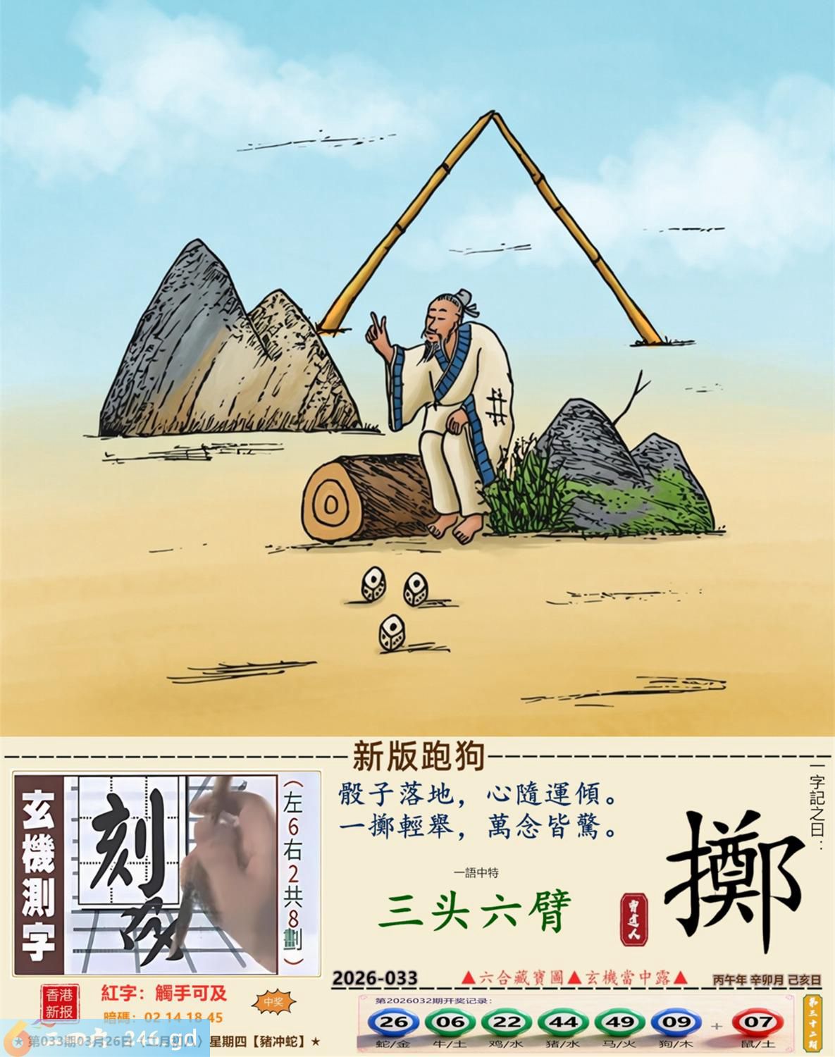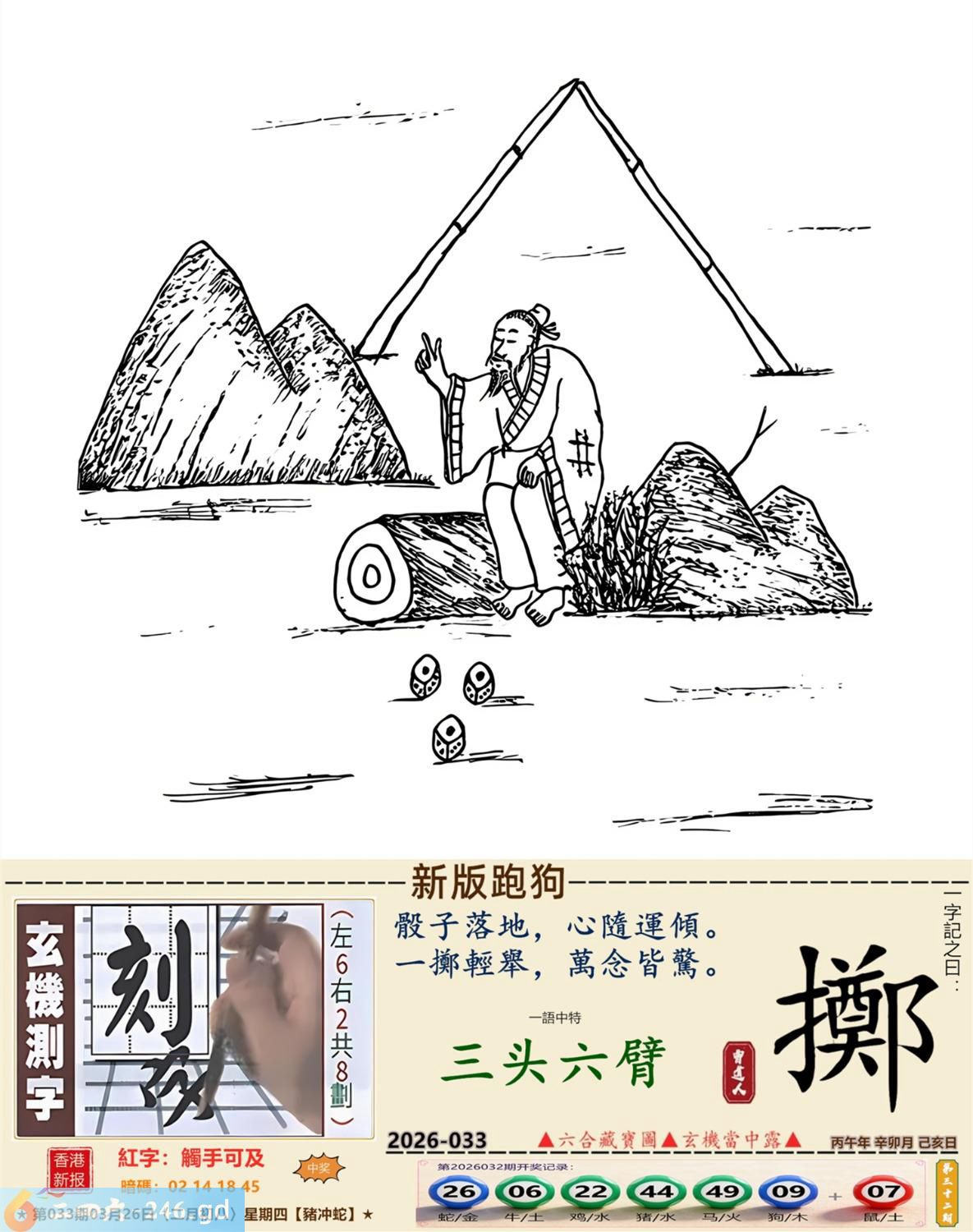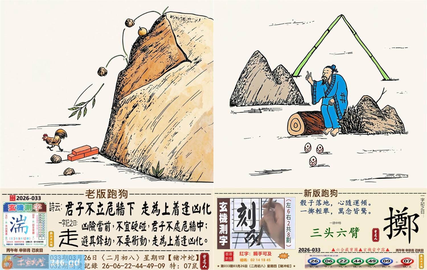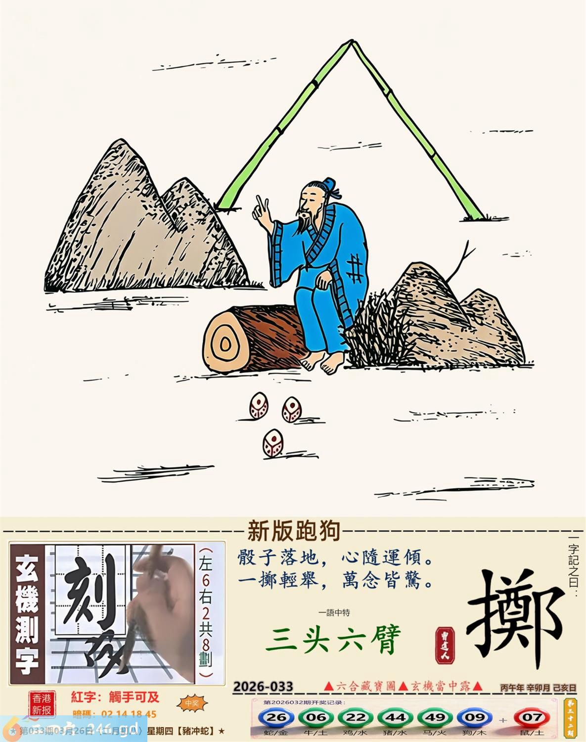 3月26日星期四平地木豬日沖蛇 033期:老版跑狗玄機一字記之曰:【走】 詩云:君子不立危牆下,走為上招逢凶化。 凶險當前,不宜硬碰,君子不立危牆下; 避其鋒劫,不要沖動,走為上招逢凶化。 玄機測字:《湍》 密圖詩:方圓十里無客棧 記:一八相伴漏紅珠 特碼大小單雙句:長話短說 今期必中:關羽 033期:特碼歇后語 秦始皇修长城-----功过后人评 033期正版四字梅花诗:炊沙成饭。 033期火车头:烧伤龙。诗:蛇死猪伤,马到边尾看其数。 033期香港第一手欲钱料:水? 033期曾道人说:“三人?” 033期另版四字梅花诗:青山绿水。 033期香港第一手欲钱料:欲钱看跑得快的生肖。 033期曾道人说:“为什么初恋的情人总比较难忘”? 033期:二字经:绿蓝。 033期:恐龙是特码 033期智力金壤:功败垂成 033期紅字:【觸手可及】 033期暗码:【02141845】 033期一語中特:【三頭六臂】 發財玄機圖:持笛吹奏席地而坐圖中明蛇紅藍 033期:藏寶圖 新:竹移不问醉与迷 老:惹窗映竹满炉烟 禁:蛇禁:8尾玄機字《要》 2026年033期【生活幽默】版 〖出軌〗 小麗嫁给了富二代。不久後富二代出軌了,而且臭名遠揚。小麗十分生氣,質問老公:“真没有看出你是侗流男,怪我瞎了眼!” 富二代很平静:“我這一切都是為你啊!”小麗:“為我?" 富二代十分認真:“你長相雖好、可智商平庸,又没有什麼什麼特殊才能,祗因貪戀富贵嫁到我家裹,别人一直在背後戳你脊梁骨,説你道德不端,在家裹你也根本没有地位,對吧!現在我出軌成了渣男,你翻身了!”