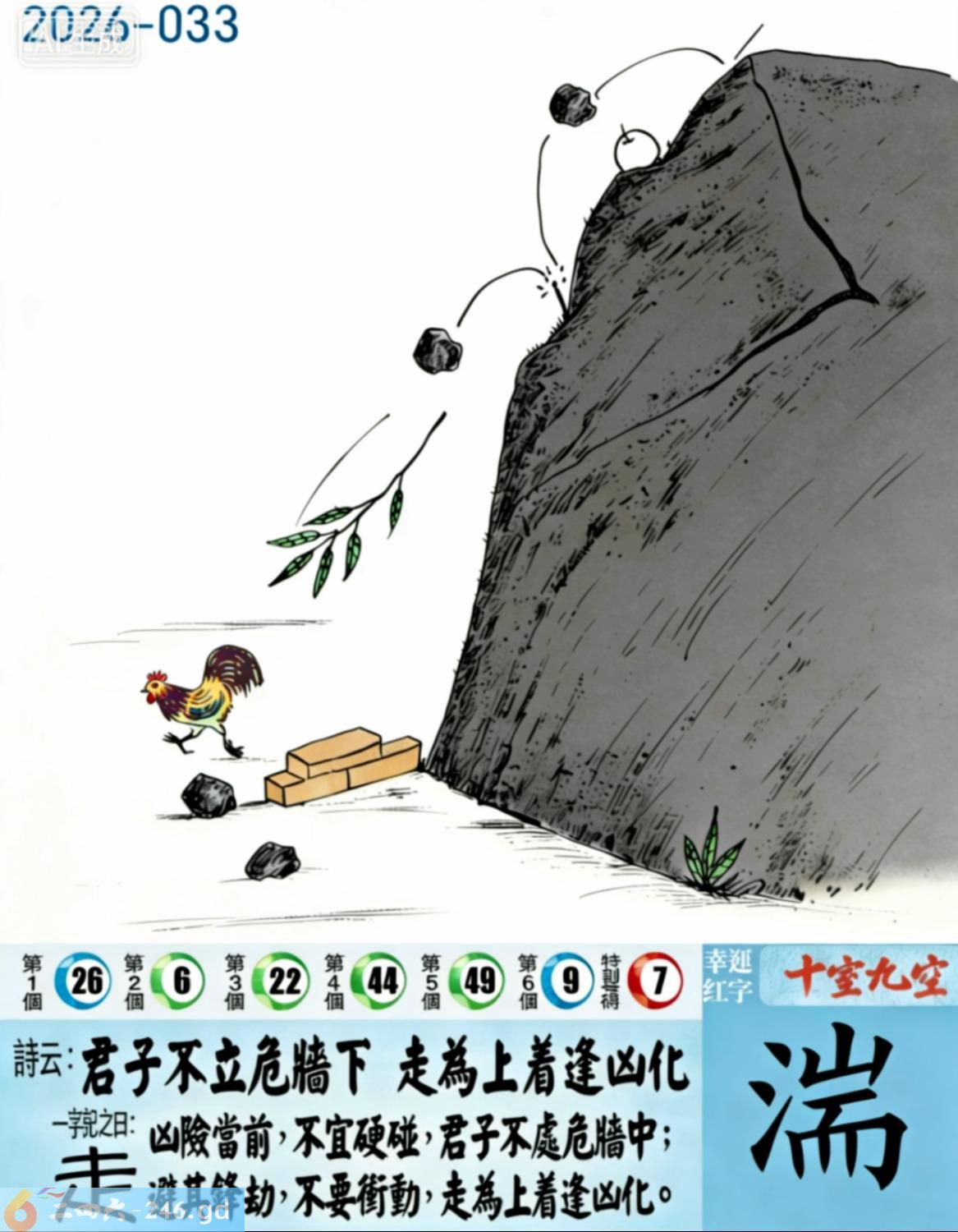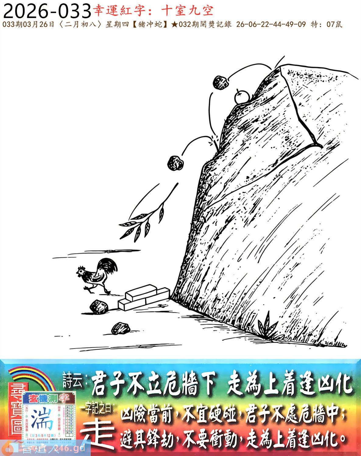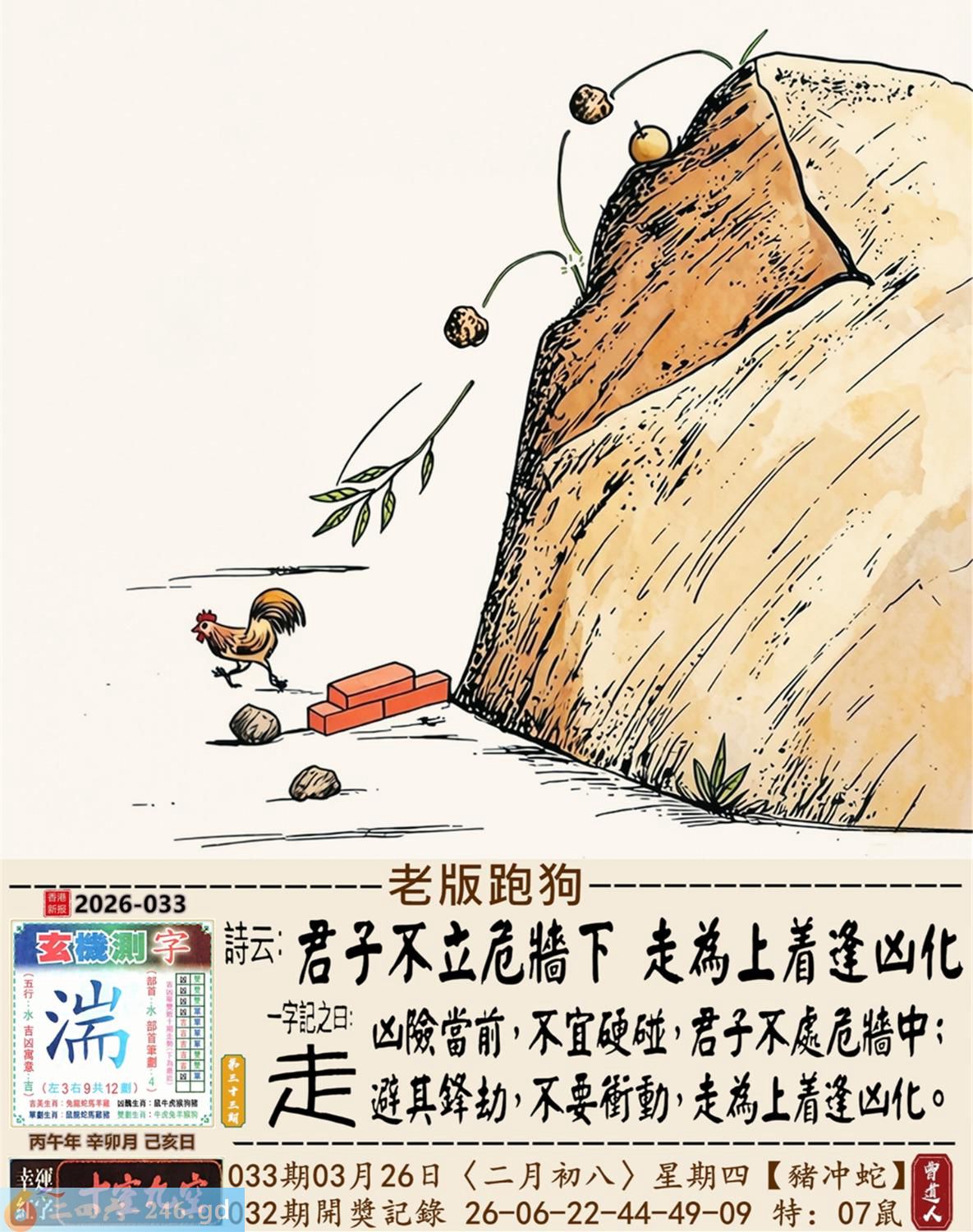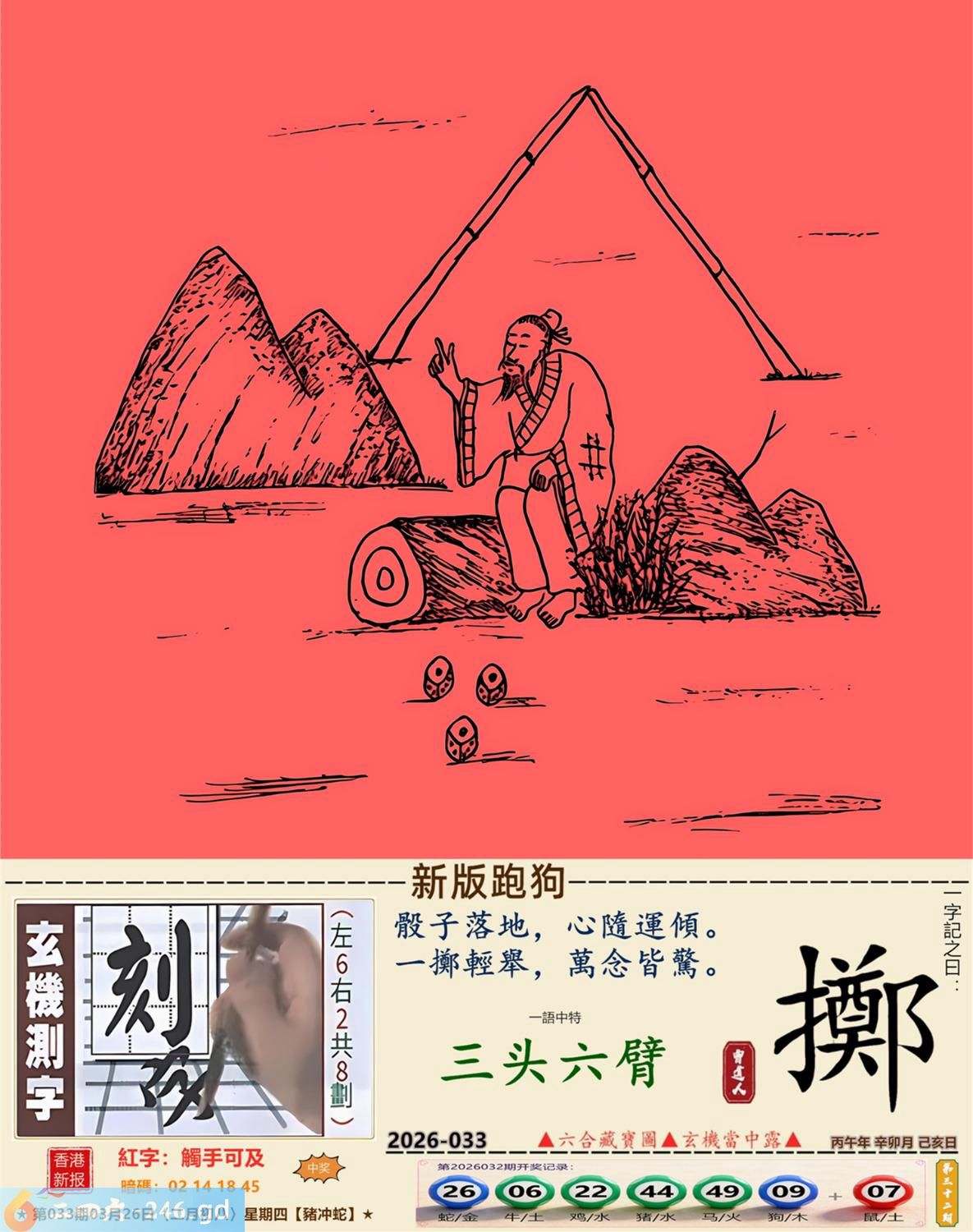 3月26日星期四平地木豬日沖蛇 033期:老版跑狗玄機一字記之曰:【走】 詩云:君子不立危牆下,走為上招逢凶化。 凶險當前,不宜硬碰,君子不立危牆下; 避其鋒劫,不要沖動,走為上招逢凶化。 玄機測字:《湍》 密圖詩:方圓十里無客棧 記:一八相伴漏紅珠 特碼大小單雙句:長話短說 今期必中:關羽 033期:特碼歇后語 秦始皇修长城-----功过后人评 033期正版四字梅花诗:炊沙成饭。 033期火车头:烧伤龙。诗:蛇死猪伤,马到边尾看其数。 033期香港第一手欲钱料:水? 033期曾道人说:“三人?” 033期另版四字梅花诗:青山绿水。 033期香港第一手欲钱料:欲钱看跑得快的生肖。 033期曾道人说:“为什么初恋的情人总比较难忘”? 033期:二字经:绿蓝。 033期:恐龙是特码 033期智力金壤:功败垂成 033期紅字:【觸手可及】 033期暗码:【02141845】 033期一語中特:【三頭六臂】 發財玄機圖:持笛吹奏席地而坐圖中明蛇紅藍 033期:藏寶圖 新:竹移不问醉与迷 老:惹窗映竹满炉烟 禁:蛇禁:8尾玄機字《要》 2026年033期【生活幽默】版 〖出軌〗 小麗嫁给了富二代。不久後富二代出軌了,而且臭名遠揚。小麗十分生氣,質問老公:“真没有看出你是侗流男,怪我瞎了眼!” 富二代很平静:“我這一切都是為你啊!”小麗:“為我?" 富二代十分認真:“你長相雖好、可智商平庸,又没有什麼什麼特殊才能,祗因貪戀富贵嫁到我家裹,别人一直在背後戳你脊梁骨,説你道德不端,在家裹你也根本没有地位,對吧!現在我出軌成了渣男,你翻身了!”