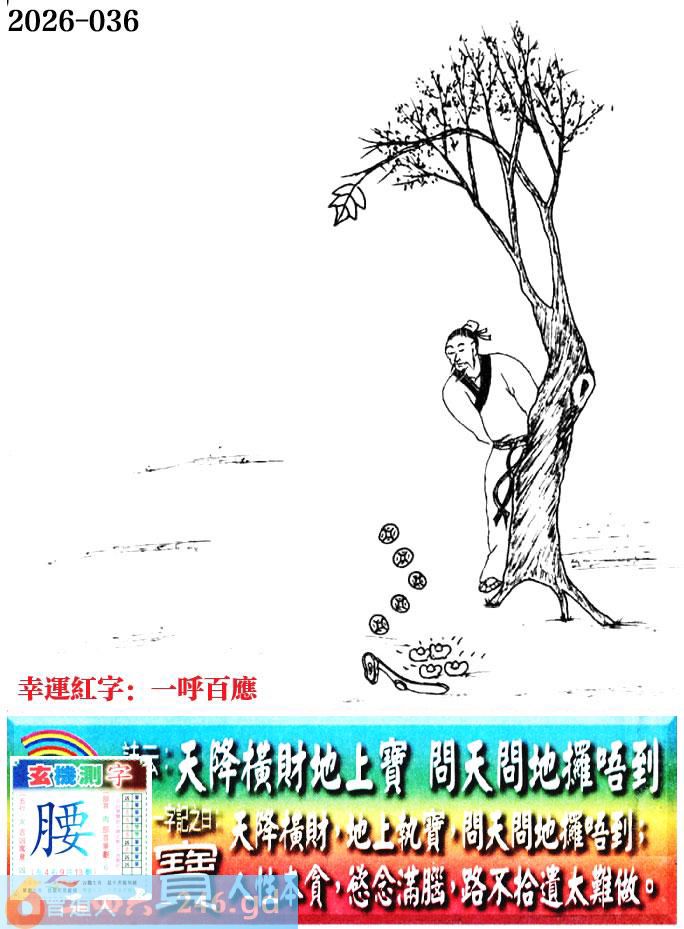 036期老版跑狗一字記之曰:【腰】 詩雲:天降橫財地上寶,問天問地攞唔到。 天降橫財,地上執寶,問天問地攞唔到; 人性本貪,慾念滿腦,路不拾遺太難做。 玄機測字:《寶》