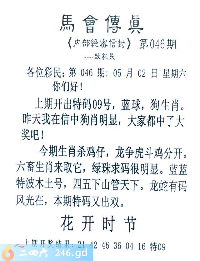 046期:首发推荐:≮馬會傳眞≯→(香港正版)