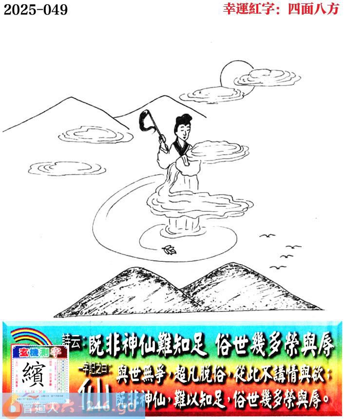 049期老版跑狗一字記之曰:【仙】 詩雲:既非神仙難知足,俗世幾多榮與辱。 與世無爭,超凡脫俗,從此不講情與欲; 既非神仙,難以知足,俗世幾多榮與辱。 玄機測字:《繽》