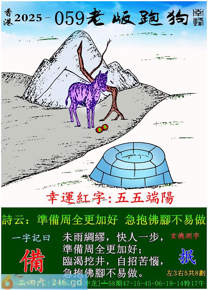 059期老版跑狗一字記之曰:【備】 詩雲:準備周全更加好,急抱佛腳不易做。 未雨綢繆,快人一步,準備周全更加好; 臨渴挖井,自招苦惱,急抱佛腳不易做。 玄機測字:《抿》