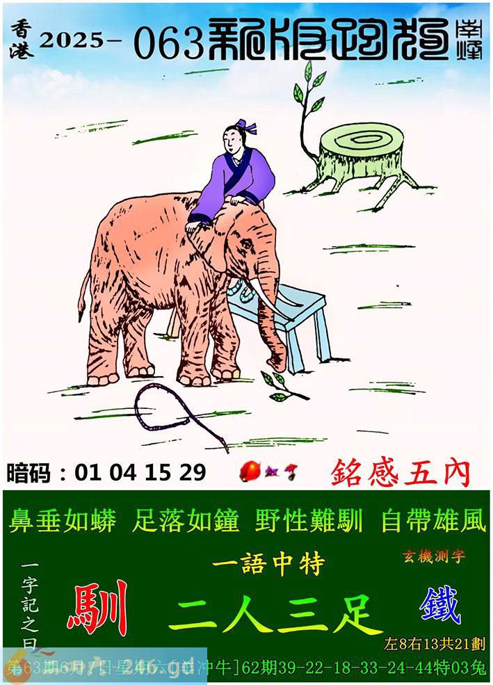 063期跑狗一字記之曰:【馴】 鼻垂如蟒,足落如鐘。 野性難馴,自帶雄風。 玄機測字:《鐵》 一語中特:二人三足