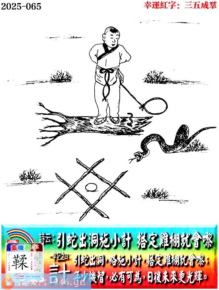 065期老版跑狗一字記之曰:【計】 詩雲:引蛇出洞施小計,搭定雞棚就會嚟。 引蛇出洞,略施小計,搭定雞棚就會嚟; 年少機智,必有可為,日後未來更光輝。 玄機測字:《鞣》