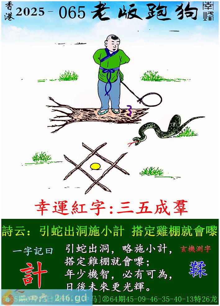 065期老版跑狗一字記之曰:【計】 詩雲:引蛇出洞施小計,搭定雞棚就會嚟。