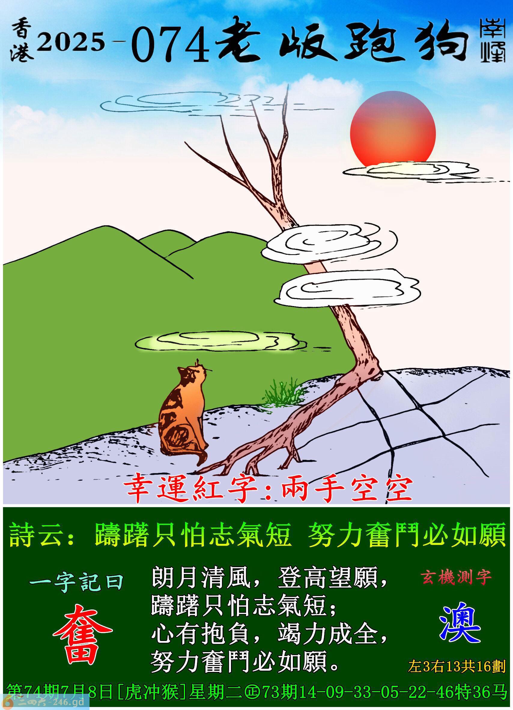 074期老版跑狗一字記之曰:【奮】 詩雲:躊躇只怕志氣短,努力奮鬥必如願。