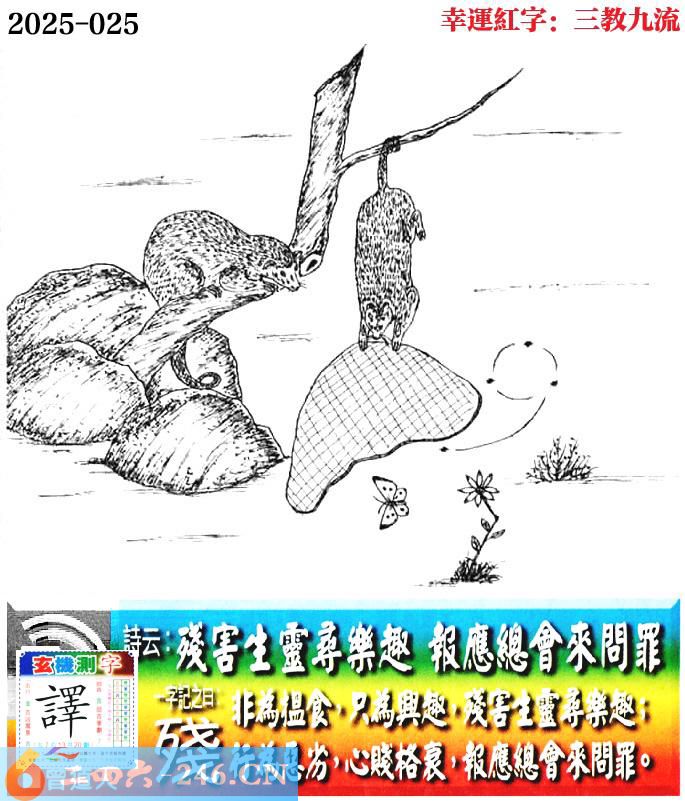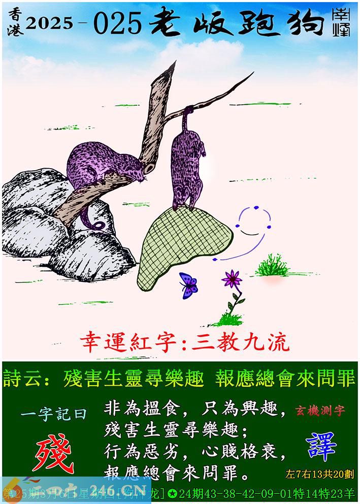 025期老版跑狗一字記之曰:【殘】 詩雲:殘害生靈尋樂趣,報應總會來問罪。 非為搵食,只為興趣,殘害生靈尋樂趣; 行為惡劣,心賤格衰,報應總會來問罪。 玄機測字:《譯》