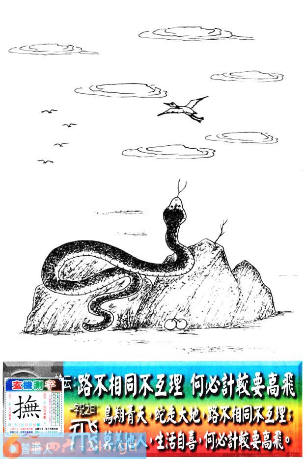 聯079期老版跑狗一字記之曰:【飛】 詩雲:路不相同不互理,何必計較要高飛。 鳥翔青天,蛇走大地,路不相同不互理; 莫羨他人,生活自喜,何必計較要高飛。 玄機測字:《撫》