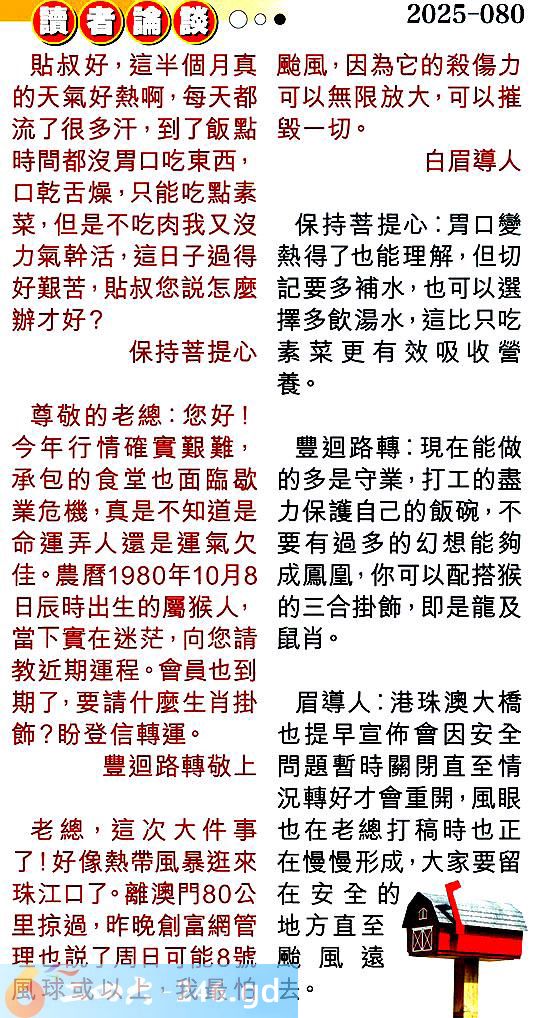 3.老總,這次大件事了!好像熱帶風暴逛來珠江口了。離澳門80公.里掠過,昨晚創富網管理也說了周日可能8號風球或以上,我最怕颱風,因為它的殺傷力可以無限放大,可以摧毁一切。白眉導人