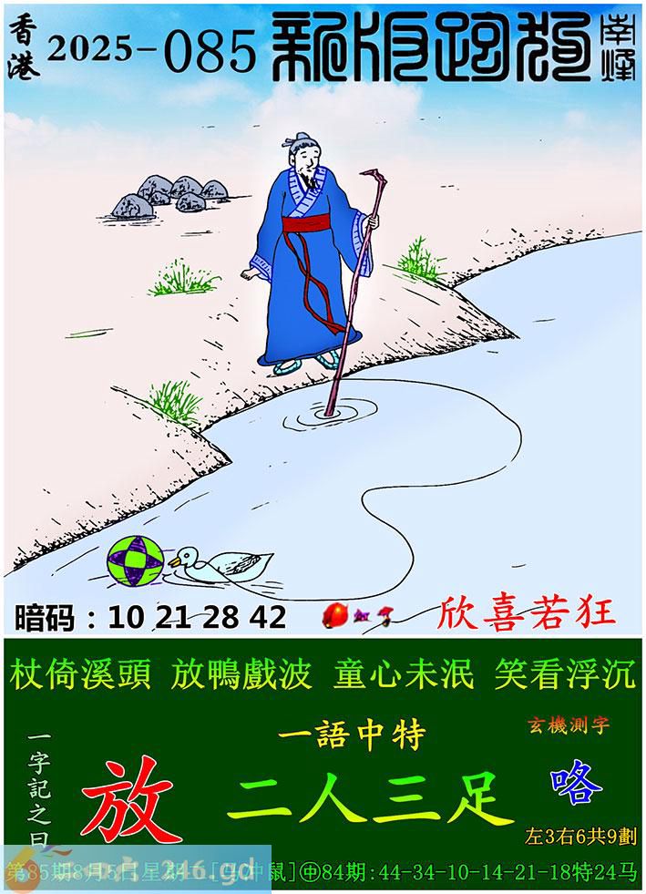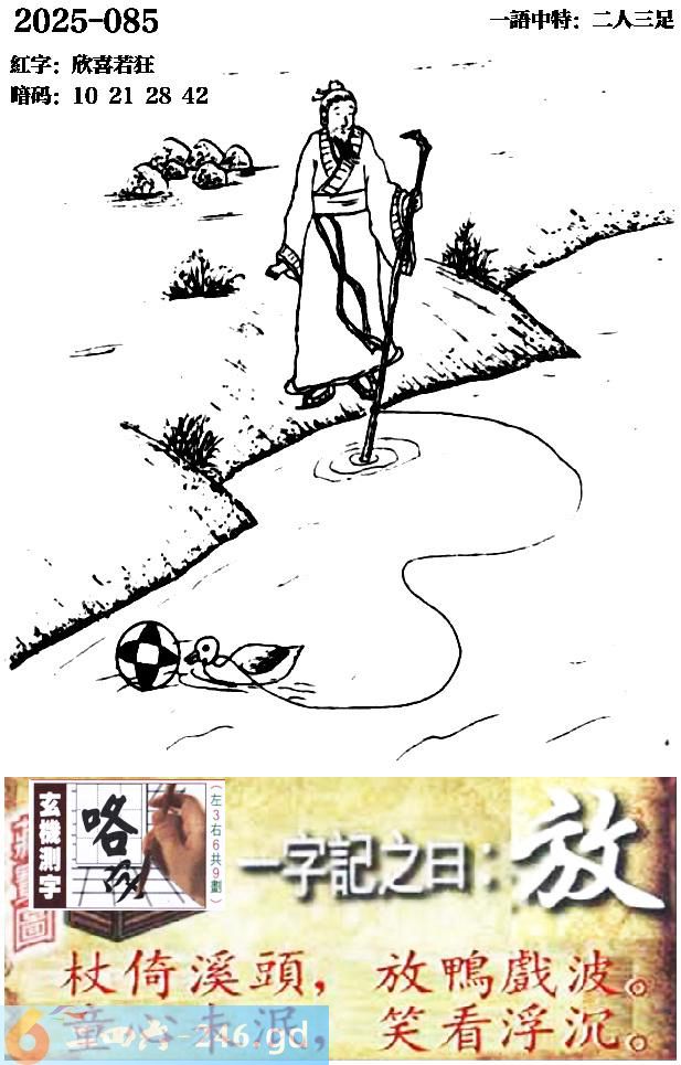 085期跑狗一字記之曰:【放】 杖倚溪頭,放鴨戲波。 童心未泯,笑看浮沈。 玄機測字:《咯》 一語中特:二人三足