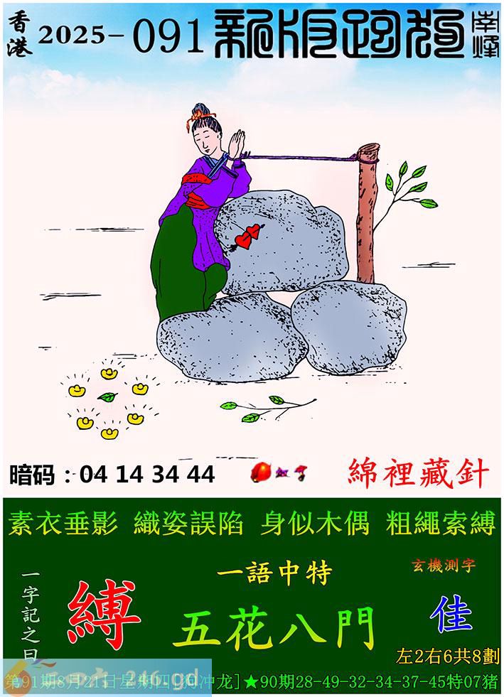 091期跑狗一字記之曰:【縛】 素衣垂影,織姿誤陷。 身似木偶,粗繩索縛。 玄機測字:《佳》 一語中特:五花八門