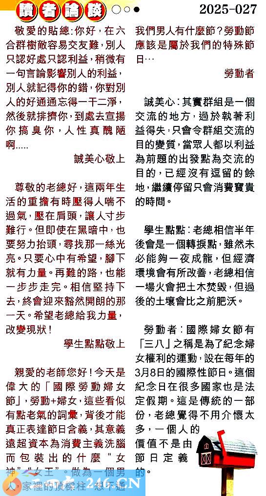 3.親愛的老師您好!今天是偉大的「國際勞動婦女節」,勞動婦女,這些看似有點老氣的詞彙,背後才能真正表達節日含義,其意義遠超資本為消費主義洗腦而包装出的什麼“女神”“女王”。做為一個男人,家裡的頂樑柱,想不通我們男人有什麼節?勞動節應該是屬於我們的特殊節...勞動者