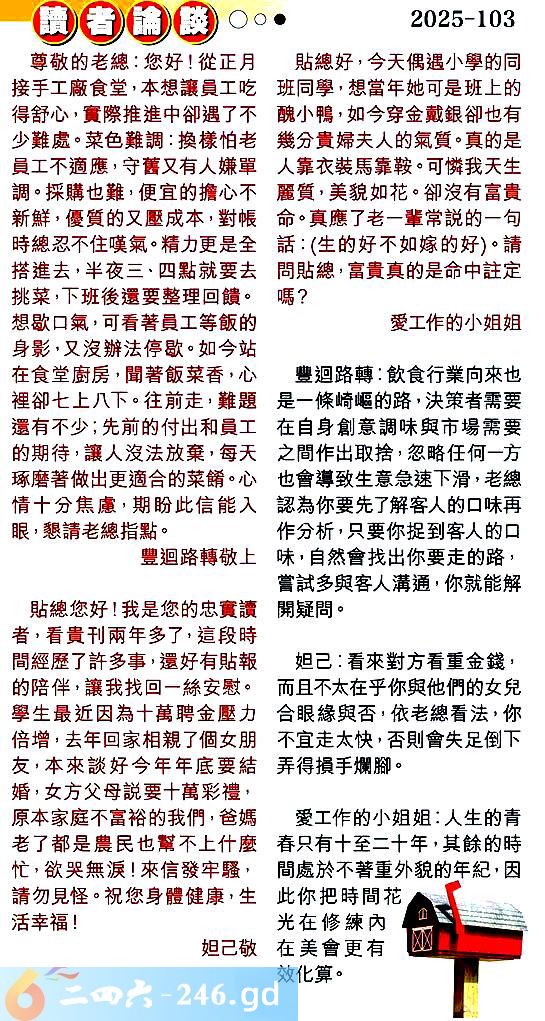 2.貼總您好!我是您的忠實讀者,看貴刊兩年多了,這段時間經歷了許多事,還好有貼報的陪伴,讓我找回一絲安慰。學生最近因為十萬聘金壓力倍增,去年回家相親了個女朋友,本來談好今年年底要結婚,女方父母說要十萬彩禮,原本家庭不富裕的我們,爸媽老了都是農民也幫不上什麼忙,欲哭無淚!來信發牢騷,請勿見怪。祝您身體健康,生活幸福!妲己敬