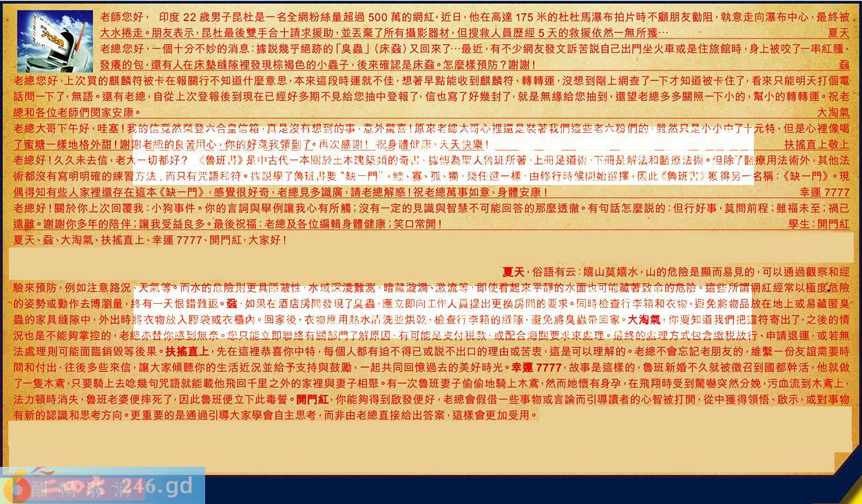 第104期《六合皇信箱文字版》10000%正確!!!正版二四六論壇*精心製作!!! 夏天、蝨、大淘氣、扶搖直上、幸運7777、開門紅,大家好! 【1】.老師您好,印度22歲男子昆杜是一名全網粉絲量超過500萬的網紅,近日,他在高達175米的杜杜馬瀑布拍片時不顧朋友勸阻,執意走向瀑布中心,最終被大水棬走。朋友表示,昆杜最後雙手合十請求援助,並丢棄了所有攝影器材,但搜救人員歷經5天的救援依然一無所獲....夏天 〖夏天〗:俗語有云:嬉山莫嬉水,山的危險是顯而易見的,可以通過觀察和經驗來預防,例如注意路況、天氣等。而水的危險則更具隱蔽性,水域深淺難測,暗藏漩渦、激流等,即使看起來平靜的水面也可能藏著致命的危險。這些所謂網紅經常以極度危險的姿勢或動作去博瀏量,終有一天恨錯雖返。 【2】.老總您好,一個十分不妙的消息:據說幾乎絕跡的「臭蟲」(床蝨)又回來了...最近,有不少網友發文訴苦說自己出門坐火車或是住旅館時,身上被咬了一串紅腫、發癢的包,還有人在床墊缝隙裡發現棕褐色的小蟲子,後來確認是床蝨。怎麼樣預防?謝謝!蝨 〖蝨〗:如果在酒店房間發現了臭蟲,應立即向工作人员提出更換房間的要求。同時檢查行李箱和衣物,避免將物品放在地上或易藏匿臭蟲的家具缝隙中,外出時將衣物放入膠袋或衣櫃內。回家後,衣物應用熱水清洗並烘乾,檢查行李箱的縫隙,避免將臭蟲帶回家。 【3】.老總您好,上次買的麒麟符被卡在報關行不知道什麼意思,本來這段時運就不佳,想著早點能收到麒麟符,轉轉運,沒想到剛上網查了一下才知道被卡住了,看來只能明天打個電話問一下了,無語。還有老總,自從上次登報後到現在已經好多期不見給您抽中登報了,信也寫了好幾封了,就是無緣給您抽到,還望老總多多關照一下小的,幫小的轉轉運。祝老總和各位老師們閔家安康。大淘氣 〖大淘氣〗:你要知道我們把靈符寄出了,之後的情況也是不能夠掌控的,老總亦替你感到無奈。您只能立即聯絡有關部門了解原因,有可能是支付税款,或配合海關要求來處理。最終的處理方式包含繳税放行、申請退運,或若無法處理則可能面臨銷毀等後果。 【4】.老總大哥下午好,哇塞!我的信竟然榮登六合皇信箱真是沒有想到的事,意外驚喜!原來老總大哥心裡還是装著我們這些老六粉們的,雖然只是小小中了十元特,但是心裡像喝了蜜糖一樣地格外甜!謝謝老總的良苦用心,你的好意我領到了。再次感謝!祝身體健康,天天快樂!扶搖直上敬上 〖扶搖直上〗:先在這裡恭喜你中特,每個人都有迫不得已或說不出口的理由或苦衷,這是可以理解的。老總不會忘記老朋友的,維繫一份友誼需要時間和付出,往後多些來信,讓大家傾聽你的生活近況並給予支持與鼓勵,一起共同回憶過去的美好時光。 【5】.老總好!久久未去信,老大一切都好?《鲁班書》是中古代一本關於土木建築類的書,據傳為聖人鲁班所著,上冊是道術,下册是解法和醫療法術。但除了醫療用法術外,其他法術都沒有寫明明確的練習方法,而只有咒語和符。據說學了魯班書要“缺一閂”,鰾、寡、孤、獨,殘任選一樣,由修行時候開始選擇,因此《鲁班害》獲得另名稱:《缺一門》。現偶得知有些人家裡還存在這本《缺一門》,感覺很好奇,老總見多識廣,請老總解惑!祝老總萬事如意,身體安康!幸運7777 〖幸運7777〗:故事是這樣的,鲁班新婚不久就被徵召到國都幹活,他就做了一隻木鳶,只要騎上去嗆幾句咒語就能載他飛回千里之外的家裡與妻子相聚。有一次魯班妻子偷偷地騎上木鳶,然而她懷有身孕,在飛翔時受到驚嚇突然分娩,污血流到木鳶上,法力頓時消失,魯班老婆便摔死了,因此魯班便立下此毒誓。 【6】.老總好!關於你上次回覆我:小狗事件。你的言詞與舉例讓我心有所觸;沒有一定的見識與智慧不可能回答的那麼透徹。有句話怎麼說的:但行好事,莫問前程;雖福未至;禍已遠離。謝謝你多年的陪伴;讓我受益良多。最後祝福:老總及各位編輯身體健康;笑口常開!學生:開門紅 〖開門紅〗:你能夠得到啟發便好,老總會假借一些事物或言論而引導讀者的心智被打開,從中獲得領悟、啟示,或對事物有新的認識和思考方向。更重要的是通過引導大家學會自主思考,而非由老總直接給出答案,這樣會更加受用。 紅字:酣暢淋漓 暗码:13162126 [释义]形容非常畅快、舒适。常指文章绘画,文艺作品感情饱满,笔意流畅,情感得到充分抒发。 [出处]《晋书·阮修传》:“常步行,以百姓挂杖头,至酒店,便独酣畅。”宋·欧阳修《释秘演诗集序》:“无所放其意,则往往从布衣野老,酣嬉淋漓,颠倒而不厌。”
