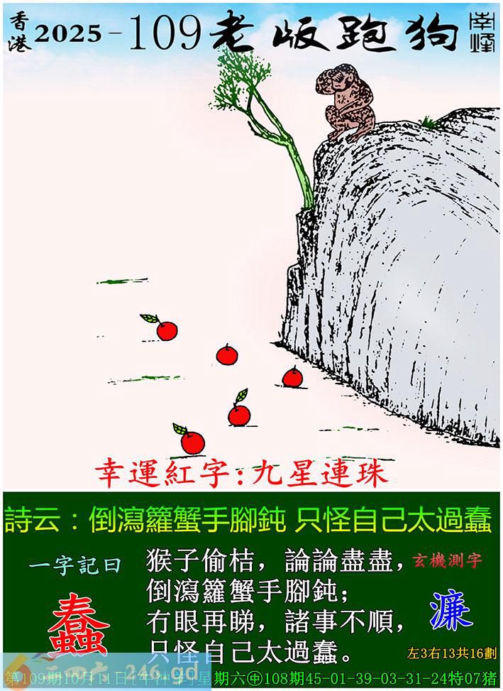 109期老版跑狗一字記之曰:【蠢】 詩雲:倒瀉籮蟹手腳鈍,只怪自己太過蠢。 猴子偷桔,論論盡盡,倒瀉籮蟹手腳鈍; 冇眼再睇,諸事不順,只怪自己太過蠢。 玄機測字:《濂》