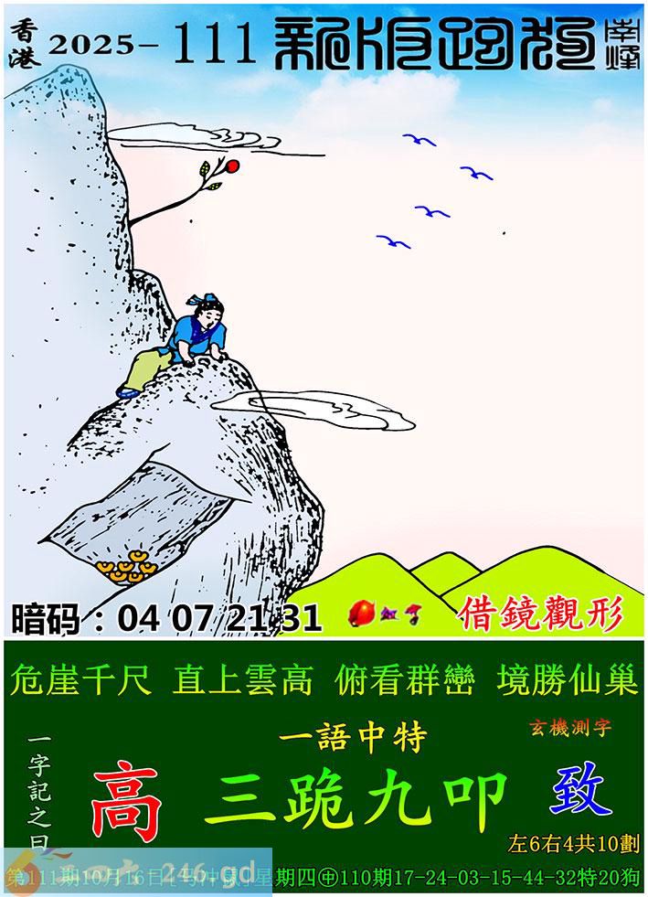 111期跑狗一字記之曰:【高】 危崖千尺,直上雲高。 俯看群巒,境勝仙巢。