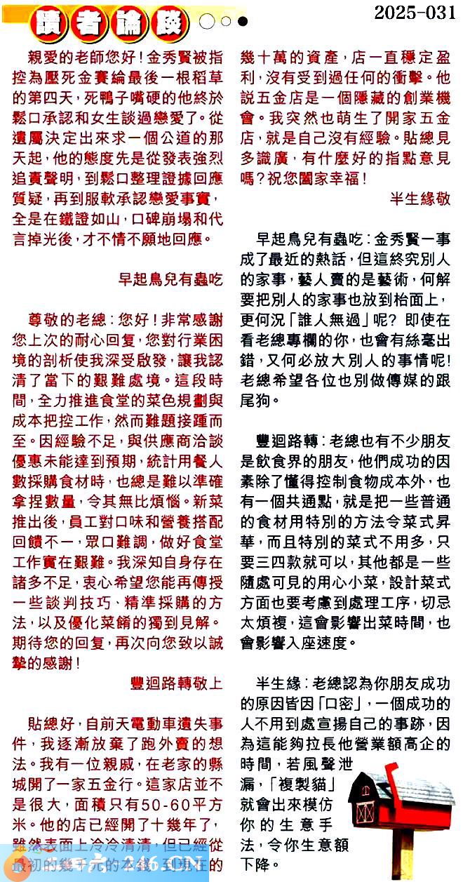 〖早起鳥兒有蟲吃〗:金秀賢一事成了最近的熱話,但這終究別人的家事,藝人賣的是藝術,何解要把別人的家事也放到拾面上,更何況「誰人無過」呢?即使在看老總專欄的你,也會有絲毫出錯,又何必放大別人的事情呢!老總希望各位也別做傳媒的跟尾狗。