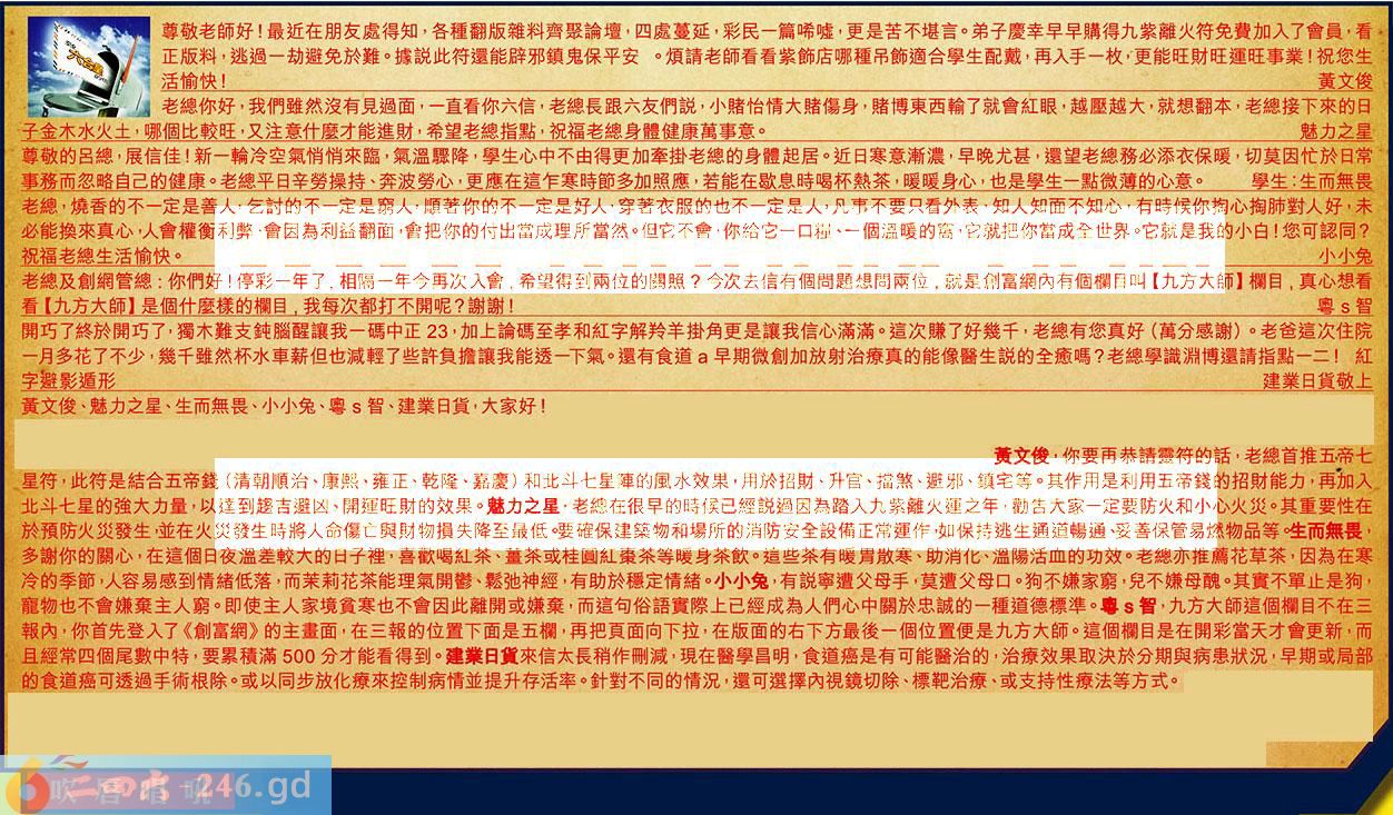 【5】.老總及創網管總:你們好!停彩一年了,相隔一年今再次入會,希望得到兩位的關照?今次去信有個間題想問兩位,就是創富網內有個欄目叫【九方太師】欄目,真心想看看【九方大師】是個什麼樣的欄目,我每次都打不開呢?謝謝!粤智