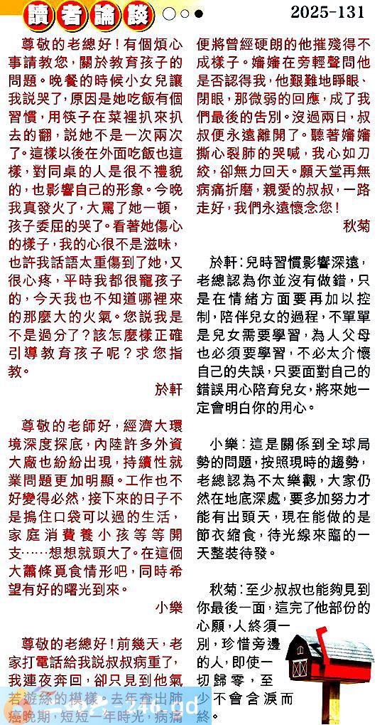 第一三一期讀者論談 1.尊敬的老總好!有個煩心事請教您,關於教育孩子的問題。晚餐的時候小女兒讓我說哭了,原因是她吃飯有個習慣,用筷子在菜裡扒來扒去的翻,說她不是一次兩次了。這樣以後在外面吃飯也這樣,對同桌的人是很不禮貌的,也影響自己的形象。今晚我真發火了,大罵了她一頓孩子委屈的哭了。看著她傷心的樣子,我的心很不是滋味,也許我話語太重傷到了她,又很心疼,平時我都很寵孩子的,今天我也不知道哪裡來的那麼大的火氣。您說我是不是過分了?該怎麼樣正確引導教育孩子呢?求您指教。於軒 〖於軒〗:兒時習慣影響深遠,老總認為你並沒有做錯,只是在情緒方面要再加以控制,陪伴兒女的過程,不單單是兒女需要學習,為人父母也必須要學習,不必太介懷自己的失誤,只要面對自己的錯誤用心陪育兒女,將來她一定會明白你的用心。 2.尊敬的老師好,經濟大環境深度探底,內陸許多外資大廠也紛紛出現,持續性就業問題更加明顯。工作也不好變得必然,接下來的日子不是搗住口袋可以過的生活,家庭消费養小孩等等開......想想就頭大了。在這個大蕭條覓食情形吧,同時希望有好的曙光到來。小樂 〖小樂〗:這是關係到全球局勢的問題,按照現時的趨勢,老總認為不太樂觀,大家仍然在地底深處,要多加努力才能有出頭天,現在能做的是節衣縮食,待光線來臨的一天整装待發。 3.尊敬的老總好!前幾天,老家打電話給我說叔叔病重了,我連夜奔回,卻只見到他氣若遊絲的模樣。去年查出肺癌晚期,短短一年時光,病痛便將曾經硬朗的他摧殘得不成樣子。嬸嬸在旁輕聲問他是否認得我,他艱難地睜眼閉眼,那微弱的回應,成了我們最後的告別沒過兩日,叔叔便永遠離開了。聽著嬸嬸撕心裂肺的哭喊,我心如刀絞,卻無力回天。願天堂再無病痛折磨,親愛的叔叔,一路走好,我們永遠懷念您!秋菊 〖秋菊〗:至少叔叔也能夠見到你最後一面,這完了他部份的心願,人終須一別珍惜旁邊的人,即使一切歸零,至少不會含淚而終。