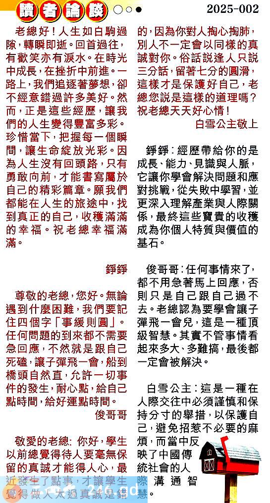 1.老總好!人生如白駒過隙,轉瞬即逝。回首過往,有歡笑亦有淚水。在時光中成長,在挫折中前進。一路上,我們追逐著萝想,卻不經意錯過許多美好。然而,正是這些經歷,讓我們的人生變得豐富多彩。珍惜當下,把握每一個瞬間,讓生命綻放光彩。因為人生沒有回頭路,只有勇敢向前,才能書寫屬於自己的精彩篇章・願我們都能在人生的旅途中,找到真正的自己,收穫滿滿的幸福。祝老總幸福滿滿。錚錚