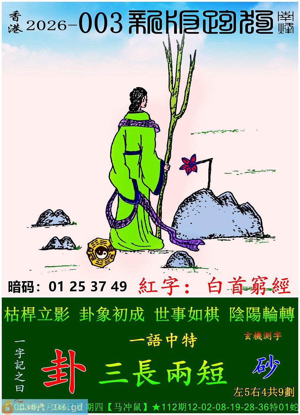 003期跑狗一字記之曰:【卦】 枯桿立影,卦象初成。 世事如棋,陰陽輪轉。 玄機測字:《砂》 一語中特:三長兩短