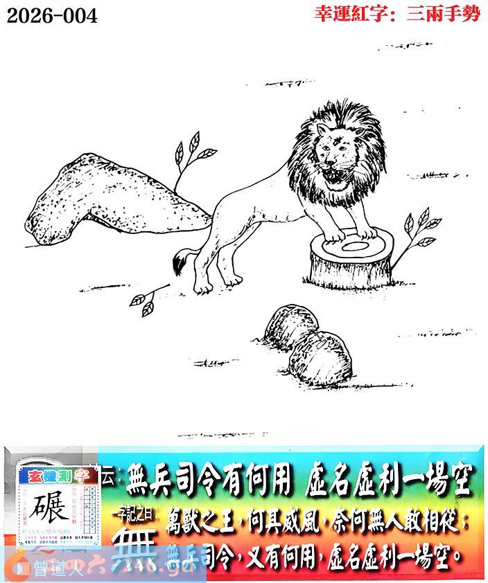 004期老版跑狗一字記之曰:【無】 詩雲:無兵司令有何用,虛名虛利一場空。 萬獸之王,何其威風,奈何無人敢相從; 無兵司令,又有何用,虛名虛利一場空。 玄機測字:《碾》