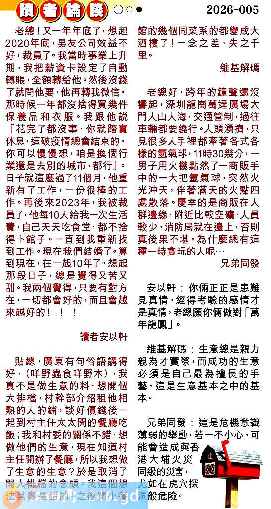 第005期讀者論談 1.老總!又一年年底了,想起2020年底,男友公司效益不好,裁員了。我當時事業上升期,我把薪資卡設定了自動轉賬,全額轉給他。然後沒錢了就問他要,他再轉我微信。那時候一年都沒捨得買幾件保養品和衣服。我跟他说「花完了都沒事,你就踏實休息,這破疫情總會結束的。你可以慢慢想,咱是換個行業還是去別的城市,都行」。日子就這麼過了11個月,他重新有了工作,一份很棒的工作。再後來2023年,我被裁員了,他每10天給我一次生活費,自己天天吃食堂,都不捨得下館子。一直到我重新找到工作。現在我們結婚了。算到現在,在一起10年了。想起那段日子,總是覺得又苦又甜。我兩個覺得,只要有對方在,一切都會好的,而且會越來越好的!!!讀者安以軒 〖安以軒〗:你倆正正是患難見真情,經得考驗的感情才是真情,老總願你倆做對「萬年龍鳳」。 2.貼總,廣東有句俗語講得好,(咩野蟲食咩野木),我真不是做生意的料,想開個大排檔,村幹部介紹租他相熟的人的鋪,談好價錢後一起到村主任太太開的餐廳吃飯;我和村委的關係不錯,想做他們的生意,現在知道村主任開辦了餐廳,所以我想做了生意的生意?於是取消了開大排檔的念頭。我這個想法其實是錯的!之後開小餐館的幾個同菜系的都變成大酒樓了!一念之差,失之千里。維基解碼 〖維基解碼〗:生意總是親力親為才實隙,而成功的生意必須是自己最為擅長的手藝,這是生意基本之中的基本。 3.老總好,跨年的鐘聲還沒響起,深圳龍崗萬達廣場大門人山人海,交通管制,過往車輛都要繞行。人頭湧擠,只見很多人手裡都牽著各式各樣的氫氣球,11時30幾分,一男子用火機點然了一商販手中的一大把氫氣球,突然火光沖天,伴著滿天的火點四處散落。慶幸的是商販在人群邊緣,附近比較空礦,人員較少,消防局就在邊上,否則真後果不堪。為什麼總有這種一時贪玩的人呢...兄弟同發 〖兄弟同發〗:這是危機意識薄弱的舉動,若一不小心,可能會造成與香港大埔火災同級的災害,尤如在虎穴探洞般危險。