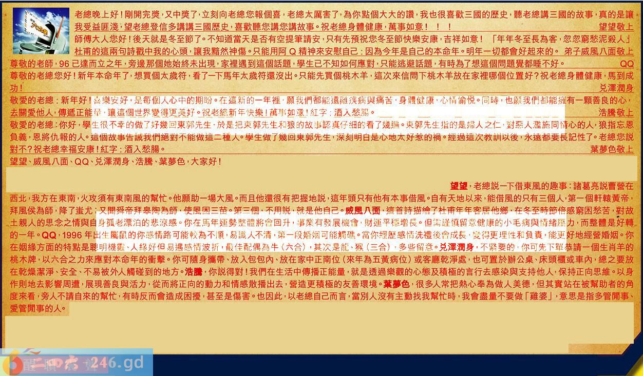 【1】.老總晚上好!剛開完獎,又中獎了,立刻向老總您報個喜,老總太厲害了,為你點個大大的讃,我也很喜歡三國的歷史,聽老總講三國的故事,真的是讓我受益匪淺,望老總登信多講講三國歷史,喜歡聽您講您講故事。祝老總身體健康,萬事如意!!!望望敬上