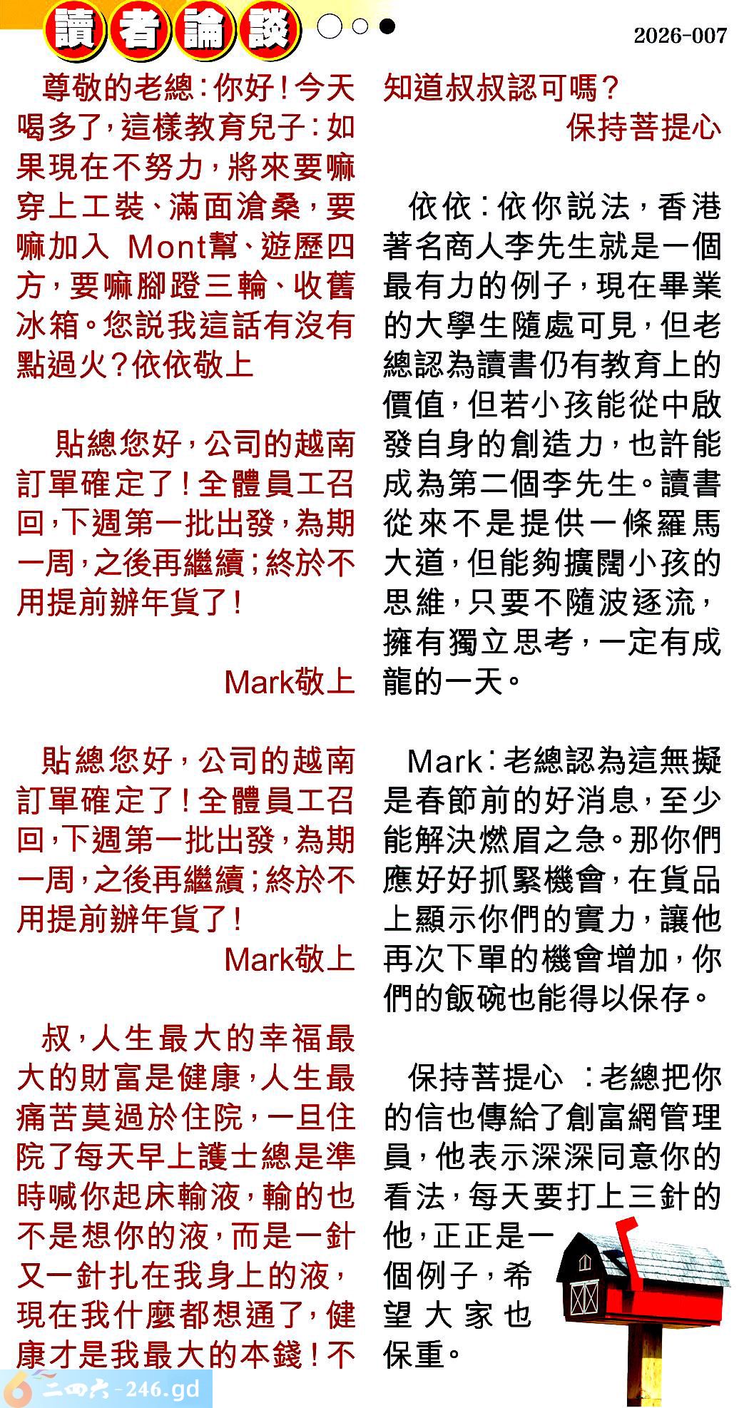 第007期讀者論談 1.尊敬的老總:你好!今天喝多了,這樣教育兒子:如果現在不努力,將來要嘛穿上工裝、滿面滄桑,要嘛加入幫、遊歷四方,要嘛腳蹬三輪、收善冰箱。您説我這話有沒有點過火?依依敬上 〖依依〗:依你説法,香港著名商人李先生就是一個最有力的例子,現在畢業的大學生隨處可見,但老總認為讀書仍有教育上的價值,但若小孩能從中啟發自身的創造力,也許能成為第二個李先生。讀書從來不是提供一條羅馬大道,但能夠擴闊小孩的思維,只要不隨波逐流,擁有獨立思考,一定有成龍的一天。 貼總您好,公司的越南訂單確定了!全體員工召回,下週第一批出發,為期一周,之後再繼續;終於不用提前辦年貨了!敬上 〖〗:老總認為這無擬是春節前的好消息,至少能解決燃眉之急。那你們應好好抓緊機會,在貨品上顯示你們的實力,讓他再次下單的機會增加,你們的飯碗也能得以保存。 叔,人生最大的幸福最大的財富是健康,人生最痛苦莫過於住院,一且住院了每天早上護士總是準時喊你起床輸液,輸的也不是想你的液,而是一針又一針扎在我身上的液,現在我什麼都想通了,健康才是我最大的本錢!不知道叔叔認可嗎?保持菩提心 〖保持菩提心〗:老總把你的信也傳給了創富網管理員,他表示深深同意你的看法,每天要打上三針的他,正正是一個例子,希区望大家也保重。