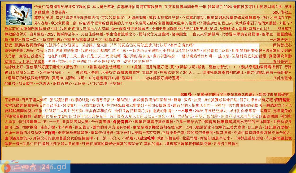 第007期《六合皇信箱文字版》10000%正確!!!正版二四六論壇*精心製作!!! 506後、烈日當空、一木破天、保持菩提心、五阿哥、八卦定乾坤,大家好! 【1】.今天在信箱裡看見老總登了我的信本人萬分感激多謝老總抽時間來幫我算卦在這裡抖膽再問老總一句我是過了2026春節後就可以主動破財嗎?祝:老總身體健康老樹長青。506後敬上 〖506後〗:主動破財的時間可以在立春之後進行,如果你去主動破財,不計回報,而又不讓人知道,就是積陰德,這樣的破財,包括慈善捐献,幫助别人,無論善款用作幫助殮葬、醫療、教育、救災、撫恤孤寡或其他用途,積了功德自然有好報。 【2】.尊敬的老總:您好!這段日子我接連去信,可次次都是泥牛入海無迴響,連個水花都沒見著,心裡真犯嘀咕:難道是因為我邏沒修成會員真身,所以才被描在了門外?老總,今次我再磨一劍,盼能得您垂青給個露臉的方寸地。我急需老總給我個轉運大風車的位置。只要這封信能登出來,我就像拿到了破門大重錘,非把??那黑莊的金庫銅門撞個粉碎不可!我想正式加入咱這六合大家庭,做一個春風得意領頭羊,不知老總可願開門迎接?拜謝老總,祝您:身體硬如金剛鑽,氣勢吞山河!烈日當空 〖烈日當空〗:常常説命運是掌握在我們自己手上,只要實行一些簡單的方法,你的運氣自然就會變好。例如心懷感激,運氣好的人把生活看作一份禮物,他們做事時總是懷著一顆感激之心。也要默默無聞地努力工作,運氣好的人專注於行動,而非自誇和炫耀,他們只會把時間花費在重要的事情上。 〖一木破天〗:2025年末已經過去,老總對你來年有一些贈言,馬年屬兔的你運程普逼好轉,是財運與桃花雙豐收的財運年與天喜桃花年,有天德貴人星入宮逢凶化吉・事業、人緣、財運皆旺,有望升職加薪。需注意破太歲可能引發的細節問题,例如與人紛爭,特別是農暦二、五、十一月,並提防因財失義,合作需謹慎。 【3】.尊敬的老師好,歲月更迭,2025轉瞬即至年末,元且佳節將近,學生懷著誠摯之心,提前祝您元旦喜樂、諸事順意!一直以來承蒙關照,此番冒昧懇請老師提摘,給學生一個露臉機會,讓我出來威一次、不負期許。衷心祝福老師事業紅紅火火,財源滾滚。一木破天敬上 【4】.叔叔,聽朋友説買紫飾店的麒麟符功效很厲害。還能讓人發大財,請問間買這個符要怎麼使用此較好?有什麼講究嗎?保持菩提心 〖保持菩提心〗:麒麟旺運靈符當然靈驗,它是一道結合了中國傳統瑞獸麒麟與風水符咒的吉祥圖案,主要功能是鎮宅化煞、招財進寶、催官升遷、求子得貴、避凶趨吉。靈符的使用方法有多種,主要是隨身揣带或放在錢包內,也可以擺放於來年家中的五黄大病位,即正南方。謹記靈符要每年更换一道新的才有功效。 【5】.尊敬的老總:您好!今天跟您扯段新鮮的家常。我們村最近熱鬧得像開了鍋,一個外地女子跟咱村小夥悄悄私定終身三年,連娃都抱了兩個,叫生米熟飯雙保險。結果當初反對的丈母娘一家現在殺過來了,堵在門口開了三天三夜,真是三天三夜連軸轉,難飛狗跳沒個完。我看著那場面,一邊感嘆這情路坎坷,一遍也想,這沒錢沒底氣的婚姻,真是風吹草動就摇晃,火上澆油沒處躲。老總,您説這生活裡的乱麻,是不是都得靠點「硬貨」才能理順?五阿哥敬上 〖五阿哥〗:老總認為無論是誰、還是任何身份,都不要阻人姻緣。佛家有云:正緣不會走散,錯的終究會離開,與其強求,不如相信時間會過濾掉不適合的人,讓你遇見對的人。身為父母的更應尊重兒女的感情選擇,不干涉、不介入、不破壞。 【6】.老總晚上好,登信果然好運了開蛇13猜對了。。。謝謝老總登信轉運。。。最近一個月時運好低,買10期輸8期,輸到一點信心都沒。。。騎共享電動車轉彎摔倒了,行路踢到石頭腳又出血了,又生病打吊針。。。去網咖玩遊戲,玩著突然遊戲數據異常,無緣無故,居然給誤封了30天......這種極低幾率的都能遇上,總之倒霉起來有一條路的。。運氣好的時候做啥都順利,買碼10期猜中8期。6肖連續猜對6期!最高峰!!!做咩都係好講時運噶八卦定乾坤 〖八卦定乾坤〗:就如斗轉星移、牝雞司晨,你要知道晨早起來,一切都是重新開始,昨天的問題就像做萝一樣。生命中往往遇到很多不如人意的事,只要在適當的時候做適當的事就好了,其他的擔心、埋怨都不會幫我們解決問题,只是多了苦惱。 紅字:杯盘狼藉 暗码:07183548 [释义]形容吃喝以后桌面杂乱的样子。 [出处]《史记·滑稽列传》:“日暮酒阑,合尊促坐,男女同席,履舄交错,杯盘狠藉。”