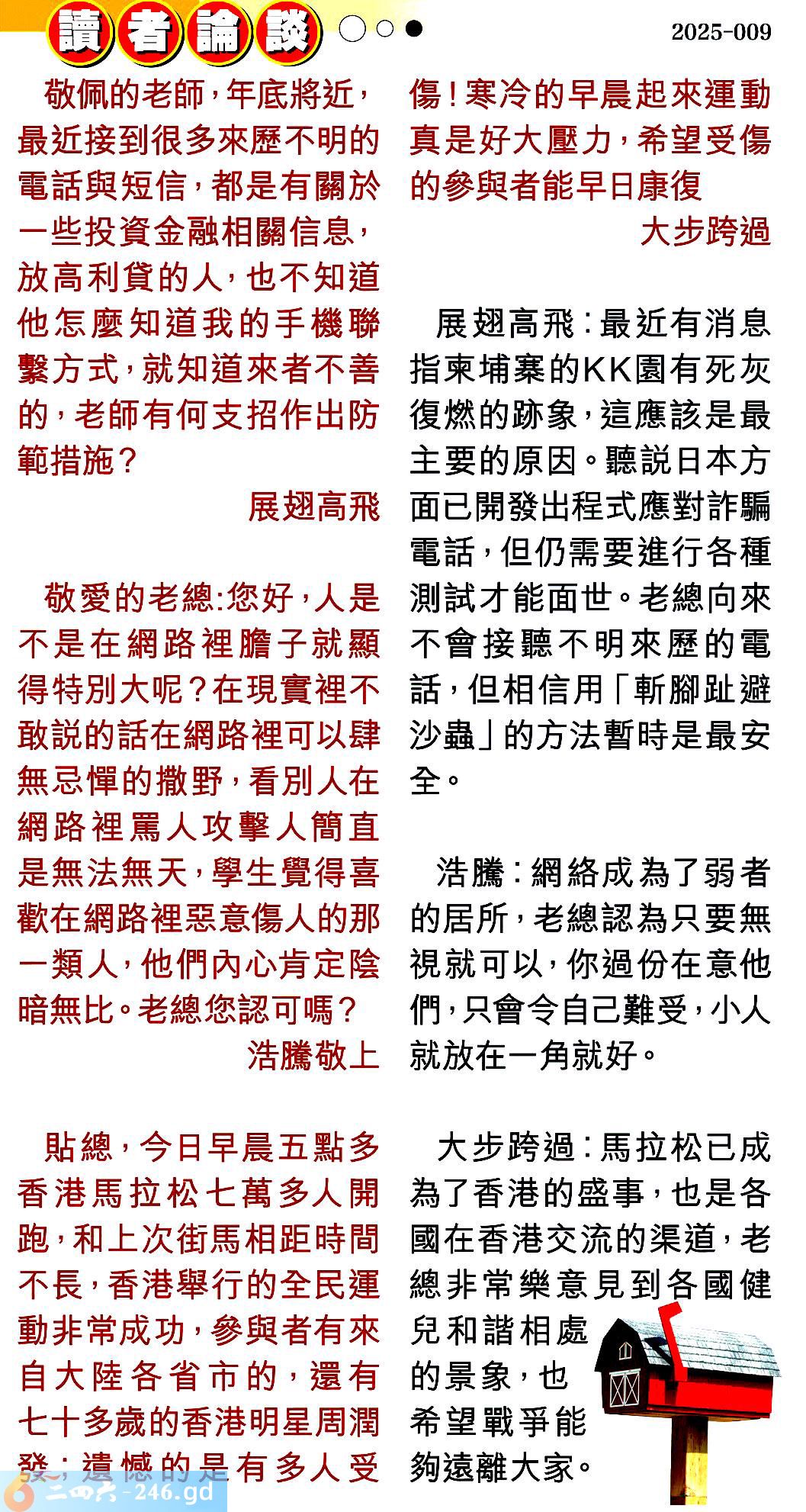 〖展翅高飛〗:最近有消息指柬埔寨的園有死灰復燃的跡象,這應該是最主要的原因。聽説日本方面已開發出程式應對詐騙電話,但仍需要進行各種測試才能面世。老總向來不會接聽不明來歷的電話,但相信用「斬腳趾避沙蟲」的方法暫時是最安全。