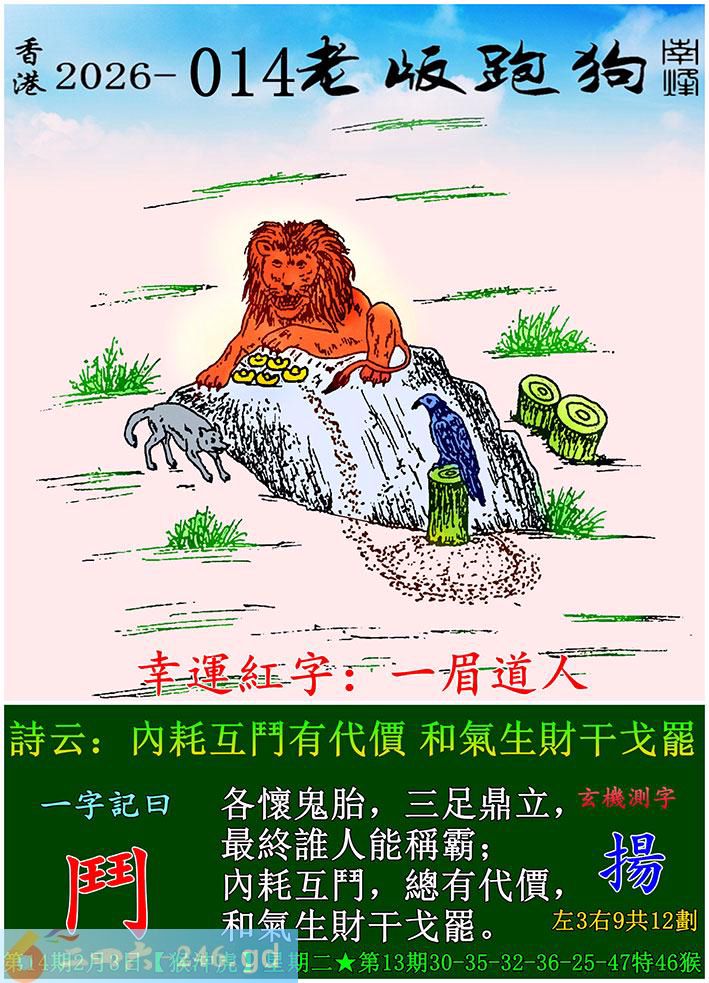014期老版跑狗一字記之曰:【鬥】 詩雲:內耗互鬥有代價,和氣生財干戈罷。