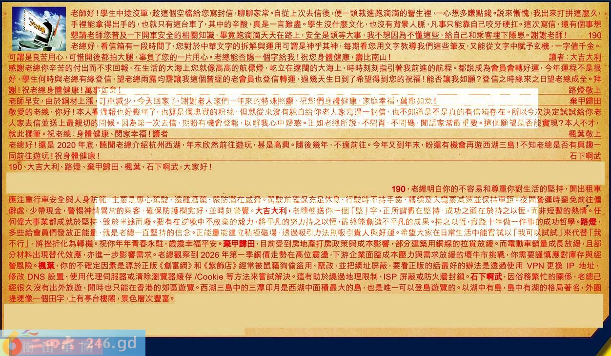 【5】.敬愛的老總,你好!本人看貴報也好幾年了,也算是個忠實的粉絲,但就從來沒有親自給你老大家寫過一封信,也不知道是不是真的有信箱存在。所以今次決定試試給你老人家去信並送上最親切的問候。因為第一次去信,期盼有機會登報山以解我心中疑惑。正如老總所説,不問肖,不問碼,開話家常最重要。這個願望是否能實現?本人不才,就此擱筆。祝老總:身體健康、閔家幸福!讀者楓莱敬上