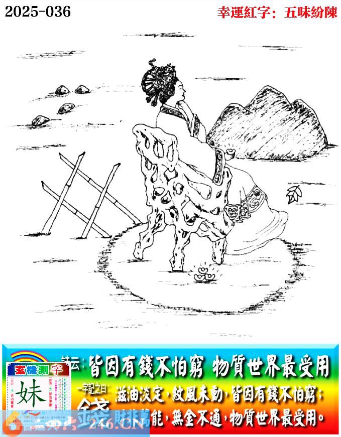 036期老版跑狗一字記之曰:【錢】 詩雲:皆因有錢不怕窮,物質世界最受用。 滋油淡定,紋風未動,皆因有錢不怕窮; 財非萬能,無金不通,物質世界最受用。 玄機測字:《妹》