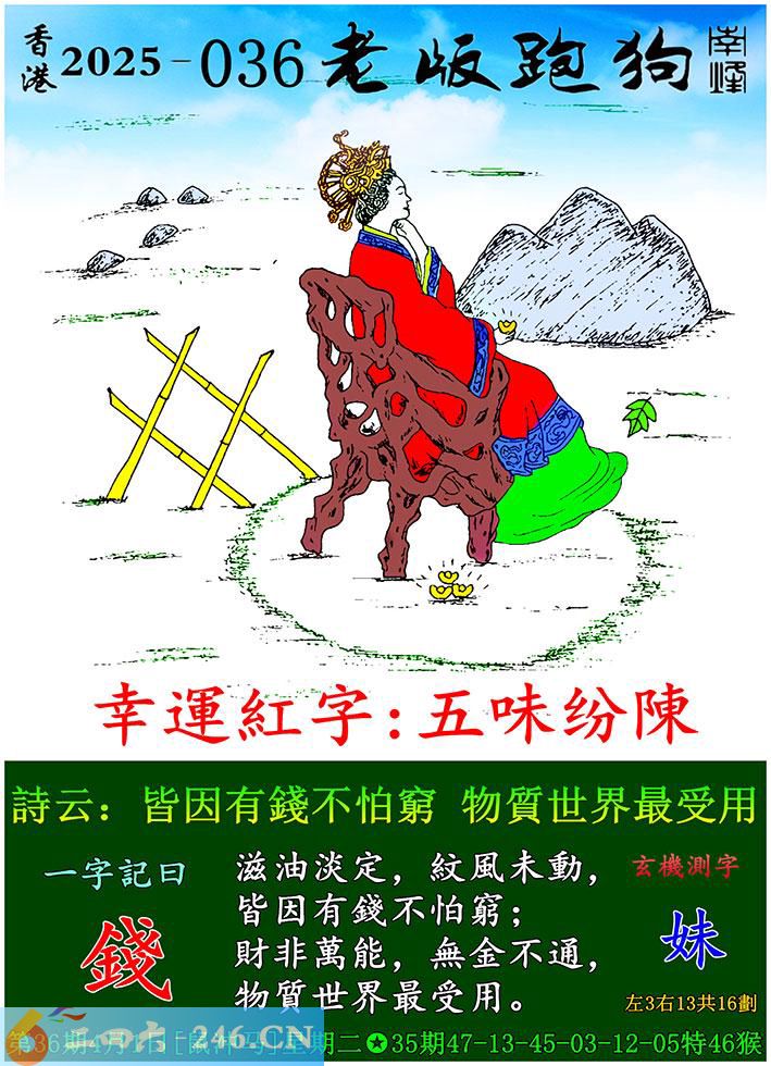 036期老版跑狗一字記之曰:【錢】 詩雲:皆因有錢不怕窮,物質世界最受用。