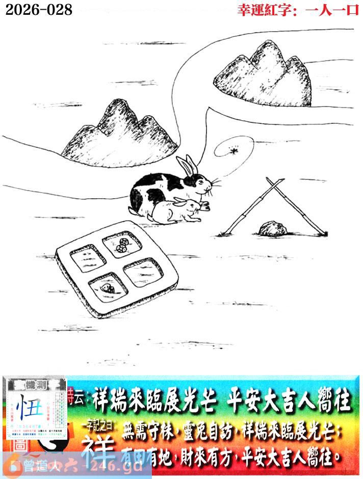 028期老版跑狗一字記之曰:【祥】 詩雲:祥瑞來臨展光芒,平安大吉人嚮往。 無需守株,靈兔自訪,祥瑞來臨展光芒; 有田有地,財來有方,平安大吉人嚮往。 玄機測字:《忸》