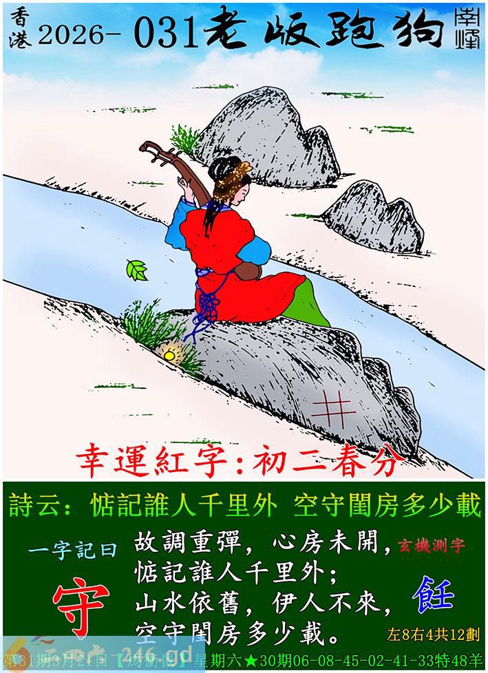 031期老版跑狗一字記之曰:【守】 詩雲:惦記誰人千里外,空守閨房多少載。