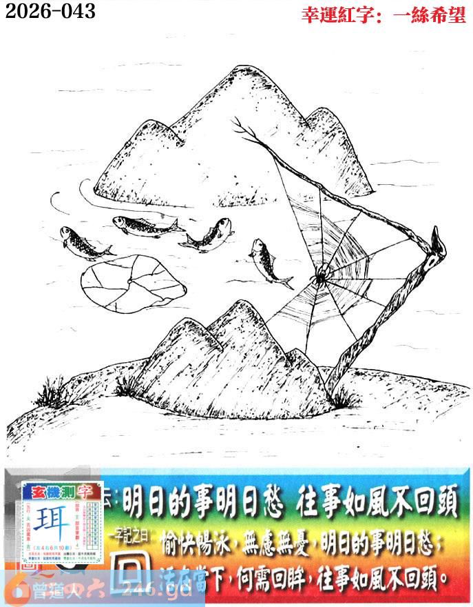 043期老版跑狗一字記之曰:【回】 詩雲:明日的事明日愁,往事如風不回頭。 愉快暢泳,無慮無憂,明日的事明日愁; 活在當下,何需回眸,往事如風不回頭。 玄機測字:《珥》